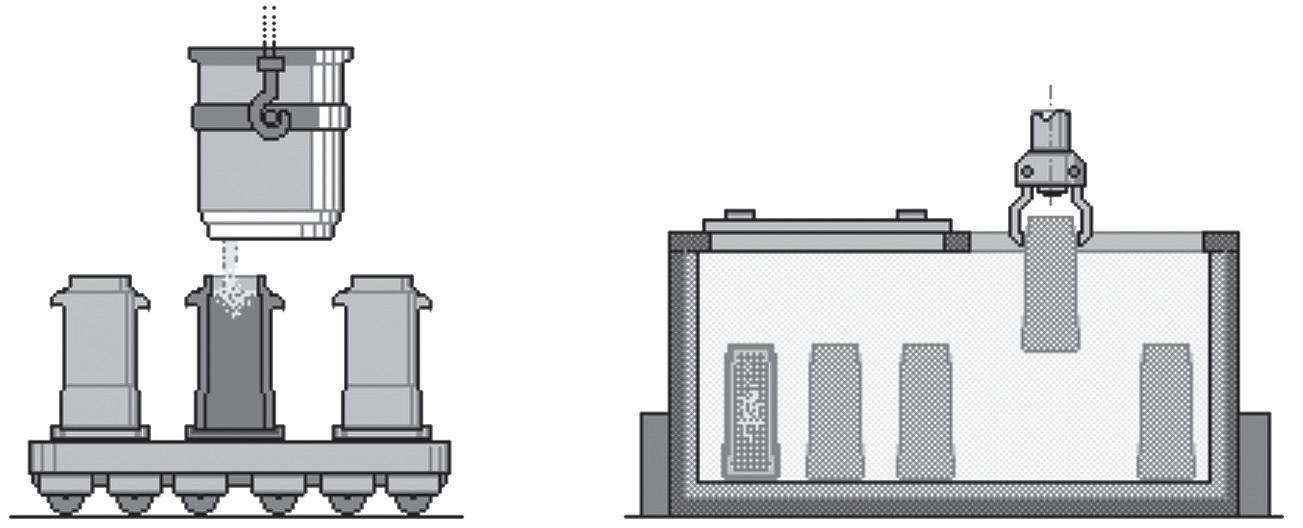 Cada lingote possuía uma forma independente. A quantidade de lingotes dependia da capacidade de aço líquido que cabia na panela e do tamanho das lingoteiras. Após o enchimento das chamadas lingoteiras (formas elaboradas em ferro fundido que recebiam o aço líquido), tinha início a solidificação, que se dava pela troca de calor com as paredes da lingoteira e, na sua parte superior, com o meio ambiente. Após algumas horas, a solidificação se completava e o vagão ferroviário com as lingoteiras e os lingotes era levado para próxima etapa do processo denominada estripamento. Nessa etapa, as lingoteiras eram removidas (Figura 9.1). Utilizava-se uma ponte rolante especial, dotada de uma espécie de “pinça” gigante, que removia a lingoteira do lingote solidificado, deixando livre o lingote sólido. Em seguida, os lingotes eram conduzidos para a etapa seguinte do processo, os chamados fornos-poço, onde seriam aquecidos para posteriormente serem transformados em produtos laminados denominados placa, bloco ou uma outra forma final desejada.