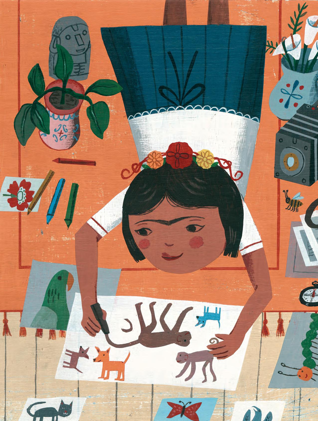 Frida estava sempre com o pai, um fotógrafo que a ensinou a olhar o mundo com olhos curiosos. Ela e o pai caminhavam até o parque para catar besouros e depois examiná-los no microscópio. O pai de Frida também a ensinou a usar tinta para dar um toque final nas fotografias. Ela adorava os pincéis pequenos e as belas cores das tintas.
