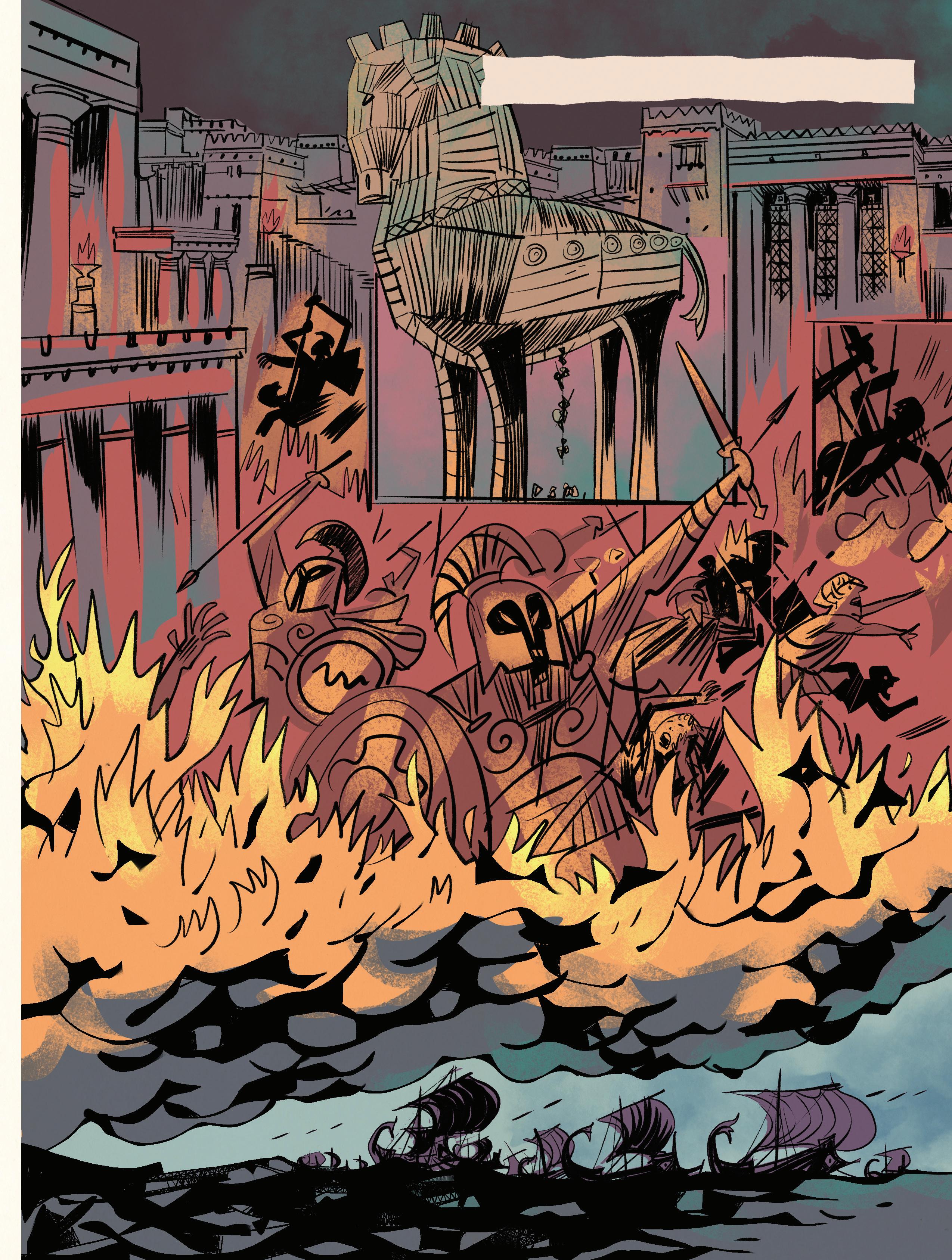 Os combates duraram dez anos e reuniram os melhores heróis de todos os tempos: Aquiles e Ájax, pelos gregos; Heitor e Eneias, pelos troianos. Homero compôs um poema sobre essa guerra, a Ilíada (Ílion é outro nome para Troia). Nele, Odisseu tem papel destacado, sobretudo por sua inteligência. É dele a ideia de construir um enorme cavalo de madeira, oco por dentro, oferecido aos troianos como um falso presente em troca da paz. Os guerreiros gregos escondidos no cavalo saem à noite, abrem os portões para seus companheiros e capturam Troia. Essa é a origem da expressão “presente de grego”, usada quando se ganha algo que traz um mal.