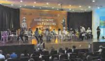 Execução musical com dois intérpretes tocando baldes em cânones rítmicos a três vozes (linhas rítmicas) em cânone.