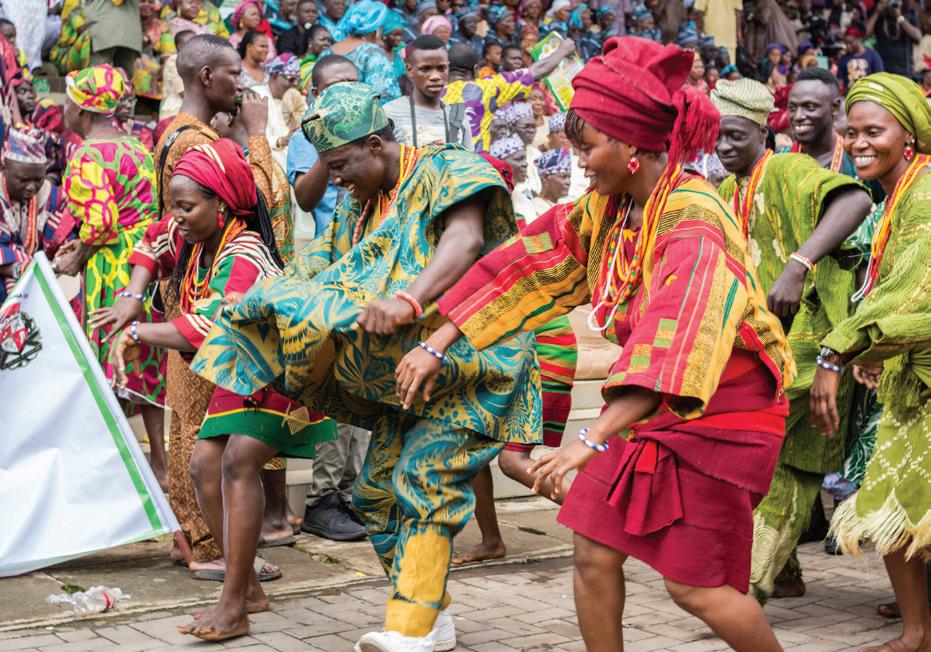 Trajes iorubás tradicionais utilizados em uma celebração na Nigéria. Para preservar a memória de suas tradições, os iorubás identificaram em muitos santos e santas católicas características das divindades africanas. Assim, tanto o catolicismo praticado em Cuba quanto as tradições religiosas trazidas do continente africano se influenciaram.