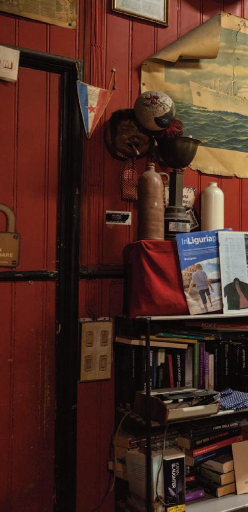 da vero lupo di mare, chi il “camugin”, cappello di lana blu col pon pon rosso dei marinai di Camogli, e chi il “caban”, il classico cappotto blu tipico dei marittimi della Bretagna. Vecchi poster della Michelangelo o dell’Atlantic dei