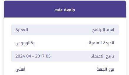 Effat University received institutional accreditation among the first six public and private universities receiving the first ever accreditation conferred by NCAAA in 2010 After acquiring national accreditation/reaccreditation for all its bachelor degrees that are eligible for accreditation, Effat University was one of the very few universities that acquired national accreditation for its master degrees - Master of Science in Translation Studies (Now known as Master of Science in Translation and Interpreting), Master of Science in Finance, and Master of Science in Urban Design Effat University acquired full re-accreditation from 2017 to 2024 and in 2024 it acquired its full re-accreditation again up to 2031.