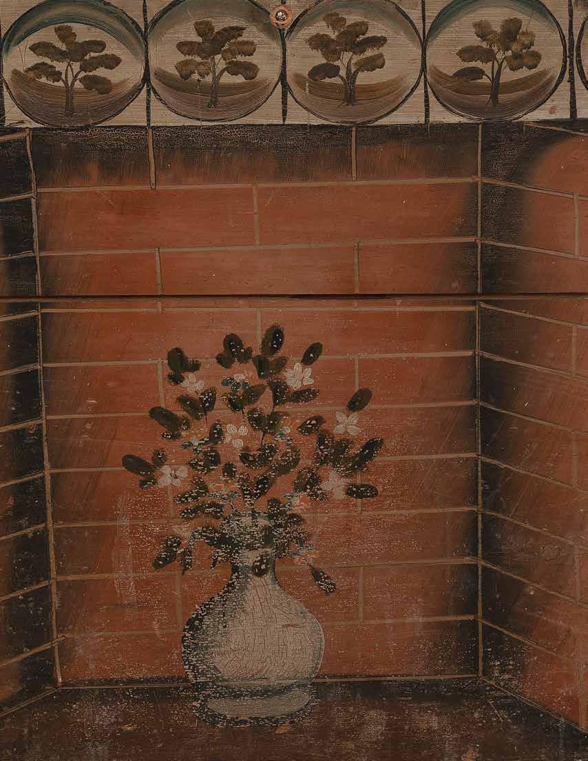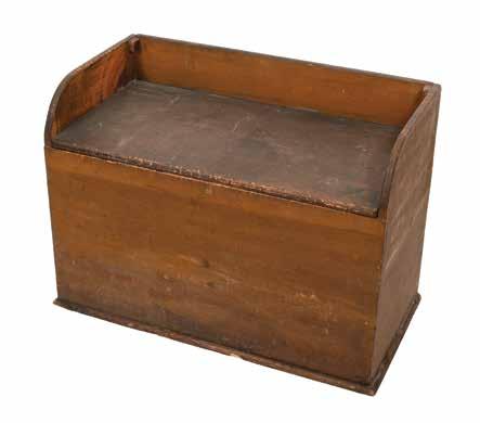 All-over deep brown decoration against a yellow ochre ground. Molded top and base. Bootjack ends. Initialed in chalk on interior, possibly “EPR”. Height 10.25”. Width 14”. Depth 7.75”. 700/1,000