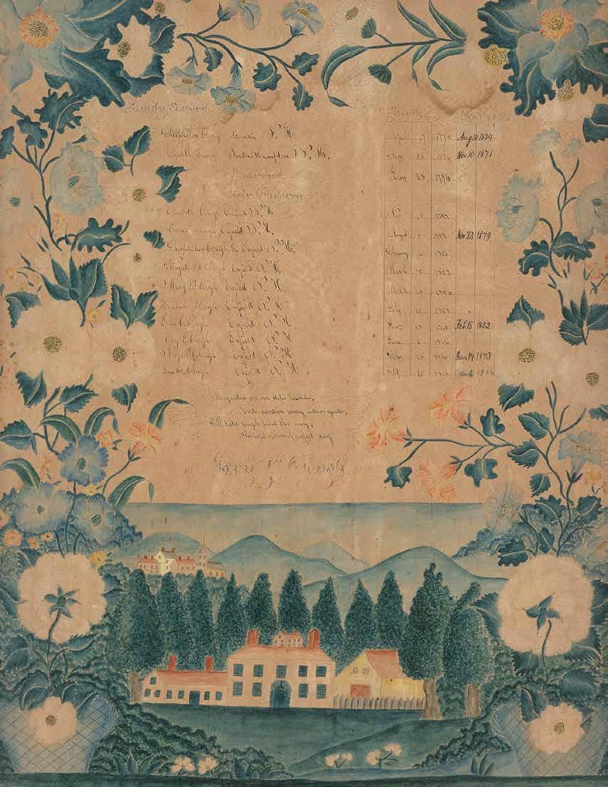 By “Charlotte A. Rugg Groton Mass. 1840 aged 12”. Shows views of the Eastern and Western hemispheres within colorful floral wreaths. Watercolor and ink on paper, 21.5” x 29.5” sight. Framed 24” x 31.5”. 5,000/10,000
