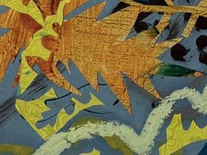 Like Martin, Jack Whitefield is imbued with the stuff of his native territory. He grew up around St Ives, still travels its land and swims its waters. The geography has seeped into his identity. His work often pro ects that immersion, not least the large-scale drawings made by striding in white clothing through burned twigs and bracken. Charcoal literally inscribed nature on to his body as he transferred his physical energy to the terrain. Whitefield communicates that emotional proximity through recorded sound, film, print, photography and, last year, in the sculptural installation called “Sapphire Pillbox”. Set up at Hweg in Penzance, those media converged to reimagine the wartime lookout at Porthcurno as a beacon of blue light connoting this jewel of a landscape. His print collage in this show “Sinking Ship” (2024) imitates sculptural space by jamming on the flat with isolated images of different sizes, shapes and colour. The cameos appear heated but disconnected and, as in a dream, seek a thread to float on. They ostle inside a single frame to convey shifting, uneven pockets of activity - a toy boat held aloft, a stretch of shore above a marine map, a handworked process underway below a figure caught posturing bizarrely.