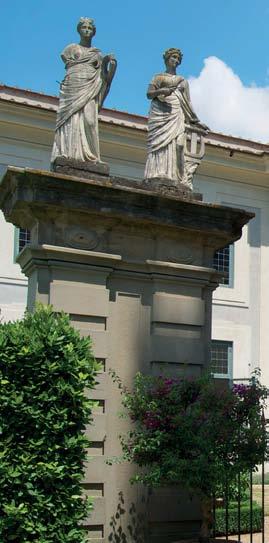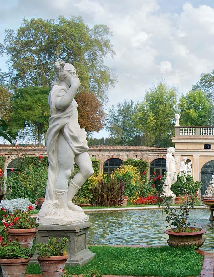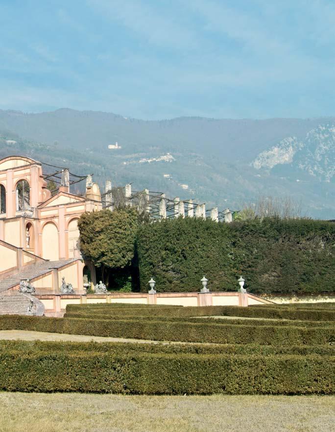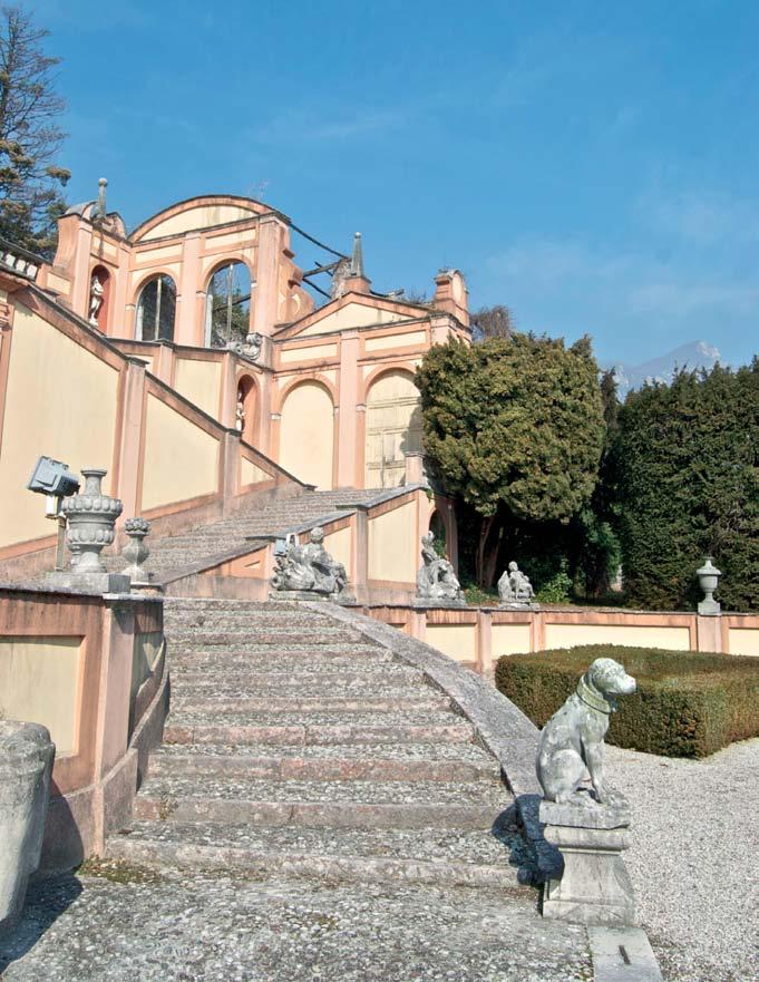 Nelle pagine seguenti: La monumentale prospettiva del giardino di Villa BettoniCazzago, straordinario connubio tra artificio architettonico e natura. L’edificio in riva al lago è connesso da due cavalcavia al giardino prospettico a monte, incentrato sulla maestosa esedra arricchita di nicchie e statue (“la più bella cosa in Lombardia”) che si collega a due “giardini di limoni”, previsti dal geniale architetto perché fungessero da quinta verde al palazzo sottostante.