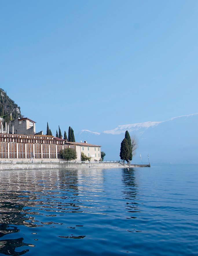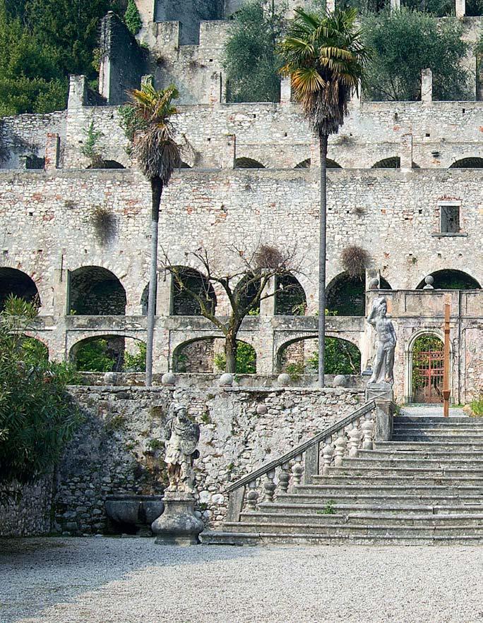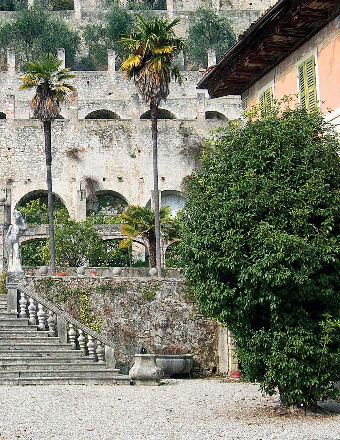 Nella pagina a fianco: L’elegante scalinata a rampe che conduce all’ingresso delle limonaie della Villa Bettoni-Cazzago, gioiello architettonico della Riviera occidentale del Garda, a Bogliaco, una frazione di Gargnano. Progettata dell’architetto veronese Adriano Cristofori, la costruzione della villa risale alla prima metà del XVIII secolo, quando già il dolce paesaggio del Garda occidentale era stato trasformato dall’uomo con l’impianto di numerosi agrumeti, i “giardini d’agrumi”. I conti Bettoni, da sempre proprietari della villa, possedevano molti terreni a Gargnano e a Limone fin dal XVI secolo, coltivati ad agrumi, ulivi e viti.