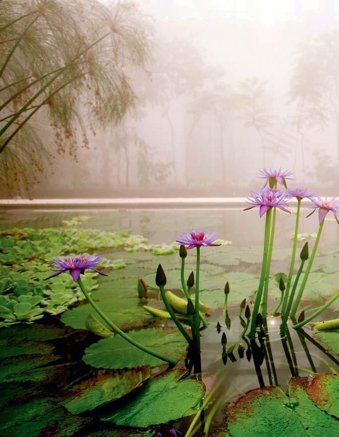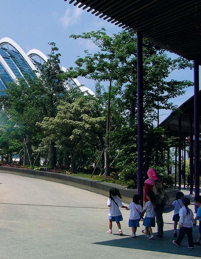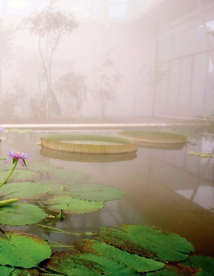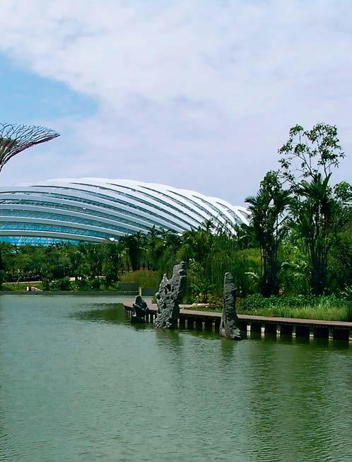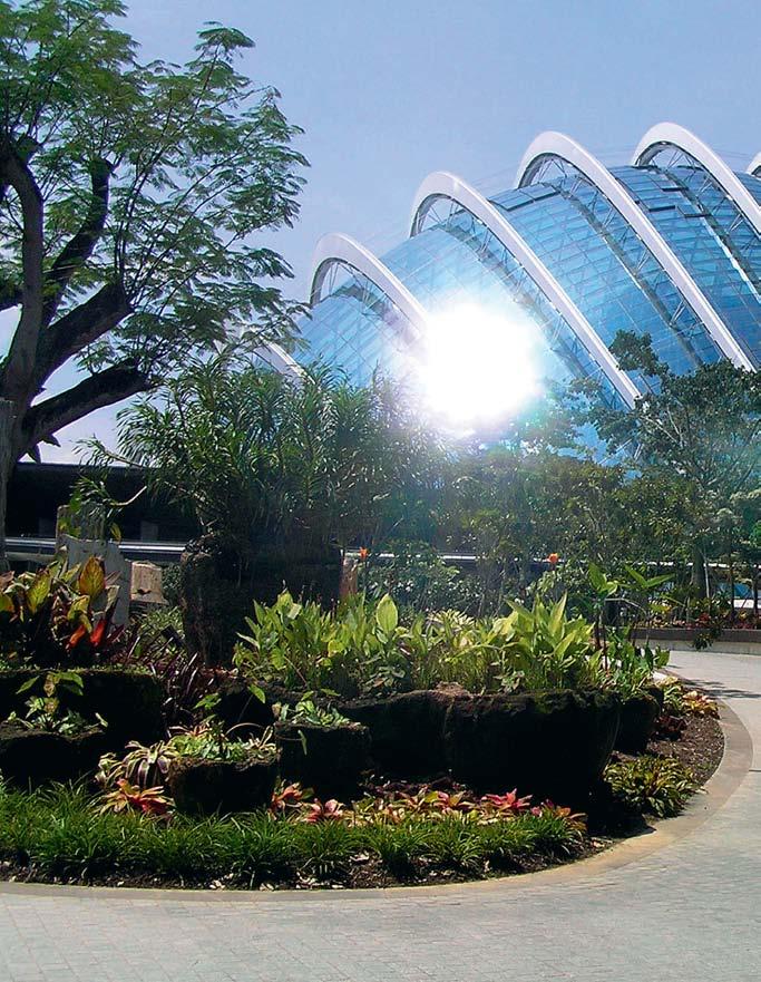 Nelle pagine precedenti: A Singapore, in una delle zone del mondo più minacciate dalla deforestazione e dall’inquinamento, sono stati istituiti nel 2012 i Gardens by the Bay, un parco di 101 ettari di terra bonificata, per fare della città “non una città giardino, ma una città in un giardino”, secondo le dichiarazioni del governo. Il profilo di Marina Bay è stato trasformato dalle forme tondeggianti delle due gigantesche serre e dal bosco dei Super Trees, i superalberi artificiali, a esse collegate. Nella foto, il Cloud Forest Conservatory, la più alta delle gigantesche serre realizzata da WilkinsonEyre. Forte dell’esperienza dell’Alpine House dei Kew Gardens di Londra, il team inglese ha realizzato una struttura di archi di acciaio che sostiene una superficie totalmente vetrata. Un sistema di vele triangolari automatizzato consente l’ombreggiatura interna della serra in caso di necessità. La serra replica le condizioni delle regioni tropicali montuose, tra i 1.000 e i 3.000 metri sul livello del mare, del Sud Est asiatico e del Centro e Sudamerica.