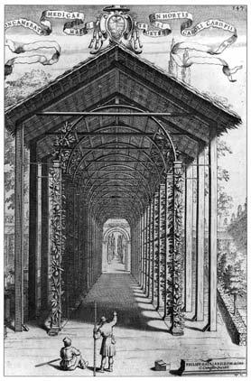 Una bella immagine, di un secolo successiva, tratta da un celebre volume tedesco dedicato alla coltura degli agrumi, il Nürbergische Hesperides (1708) di Johann Christoph Volkamer, illustra perfettamente l’ossatura di un giardino di agrumi del Garda.