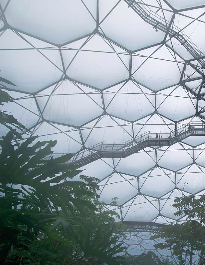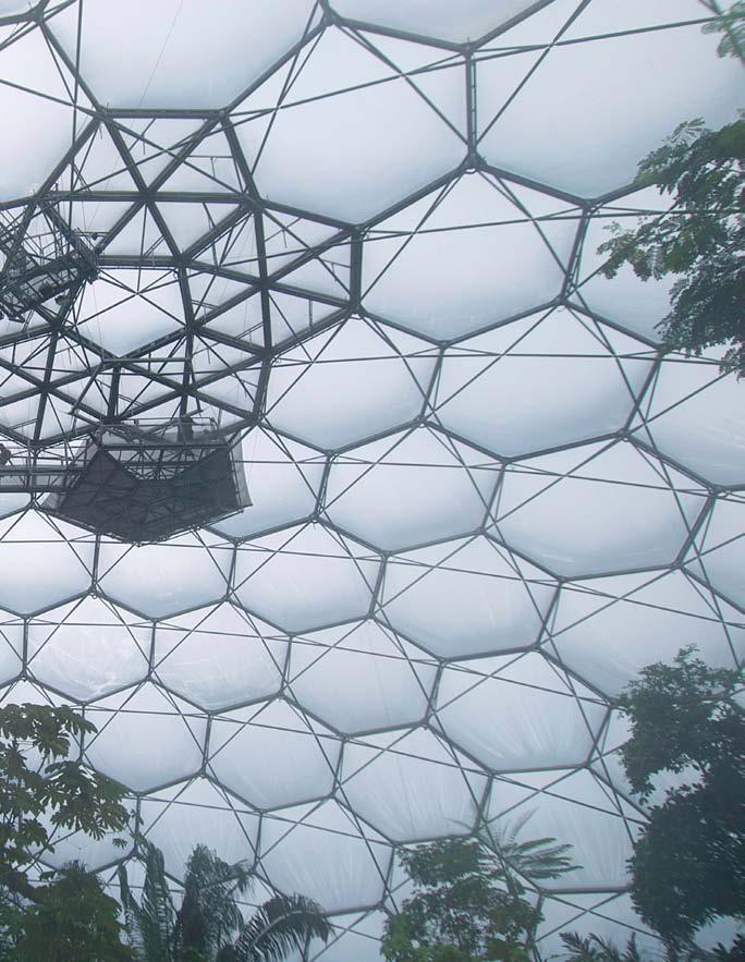 raggiungere gli 11 metri di larghezza, sono costituiti da numerosi strati di sottile pellicola EFTE trasparente ai raggi UV, sigillati intorno al loro perimetro e gonfiati per creare un cuscino, il quale funge da coperta termica per la struttura. Così protette, la foresta pluviale e la foresta mediterranea del futuro hanno attirato e attirano milioni di visitatori.