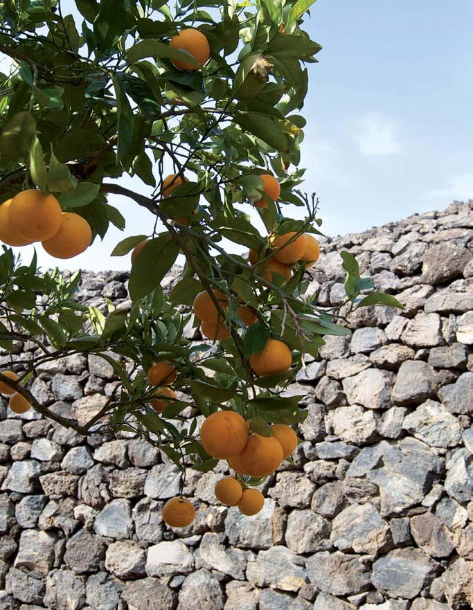 Nella pagina a fianco: Un ramo di arancio carico di frutti all’interno di un jardinu pantesco. Nel microclima che vi si crea la pianta di agrumi prospera e si sviluppa fino a occupare tutto lo spazio disponibile. Originari dell’Asia orientale e meridionale (India, Sud della Cina, Penisola indocinese, Indonesia), gli agrumi sono tra le più antiche piante coltivate dall’uomo. In Europa si diffusero in tempi diversi. Si deve agli Arabi il merito della loro coltivazione in Sicilia. La leggenda vuole che sia stato Ercole a diffondere la coltivazione degli agrumi tra gli uomini dopo aver ucciso Ladone, il serpente a due teste che vigilava sul giardino delle Esperidi dove erano custoditi i pomi d’oro che crescevano su un albero di straordinaria bellezza, l’albero della vita. Simbolo di perfezione e di immortalità, gli agrumi hanno sempre affascinato gli uomini, che per proteggerli dai rigori del freddo hanno inventato limonaie, orangerie e serre.