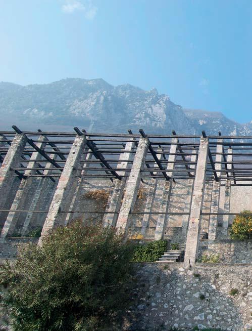 L’immagine permette di cogliere la struttura essenziale di quello straordinario edificio che è un “giardino di limoni”: un muraglione di pietra a sostegno dei terrazzamenti (le “cole”) dove i limoni sono piantati nella terra, pilastri posti a distanza regolare per segnare lo spazio destinato a ogni pianta e travi di legno regolarmente disposte per sostenere le coperture invernali.