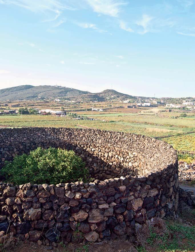 Nella pagina a fianco: “u jardinu”, un giardino arabo, si eleva tra le basse distese di vigneti nelle campagne di Pantelleria. Sparsi nell’isola si contano ancora circa 400 di questi edifici a pianta circolare, costruiti con straordinaria perizia per proteggere la delicata pianta di agrumi all’interno (in genere un solo esemplare) dalle raffiche di vento che battono costantemente l’isola e creare al tempo stesso un microclima che le consenta di difendersi dal sole implacabile.