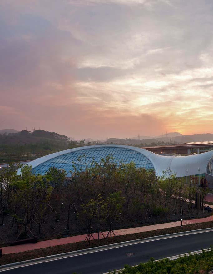 Nelle pagine seguenti: Ecorium, un’iniziativa del National Ecological Institute of South Korea. Si tratta di serre ecosostenibili in legno e plexiglas, una riserva d’acqua, aule e laboratori didattici al centro di un’area naturale di 33.000 metri quadrati, dove insegnare agli studenti l’importanza degli ecosistemi e della loro protezione. Concepito sul tema dell’“Odissea della Natura”, Ecorium riproduce gli ecosistemi di cinque differenti zone climatiche, dalle regioni tropicali a quelle polari. Il Terzo Millenio è iniziato ponendosi dubbi e timori sul futuro del pianeta. Che queste serre siano la speranza per gli anni a venire?