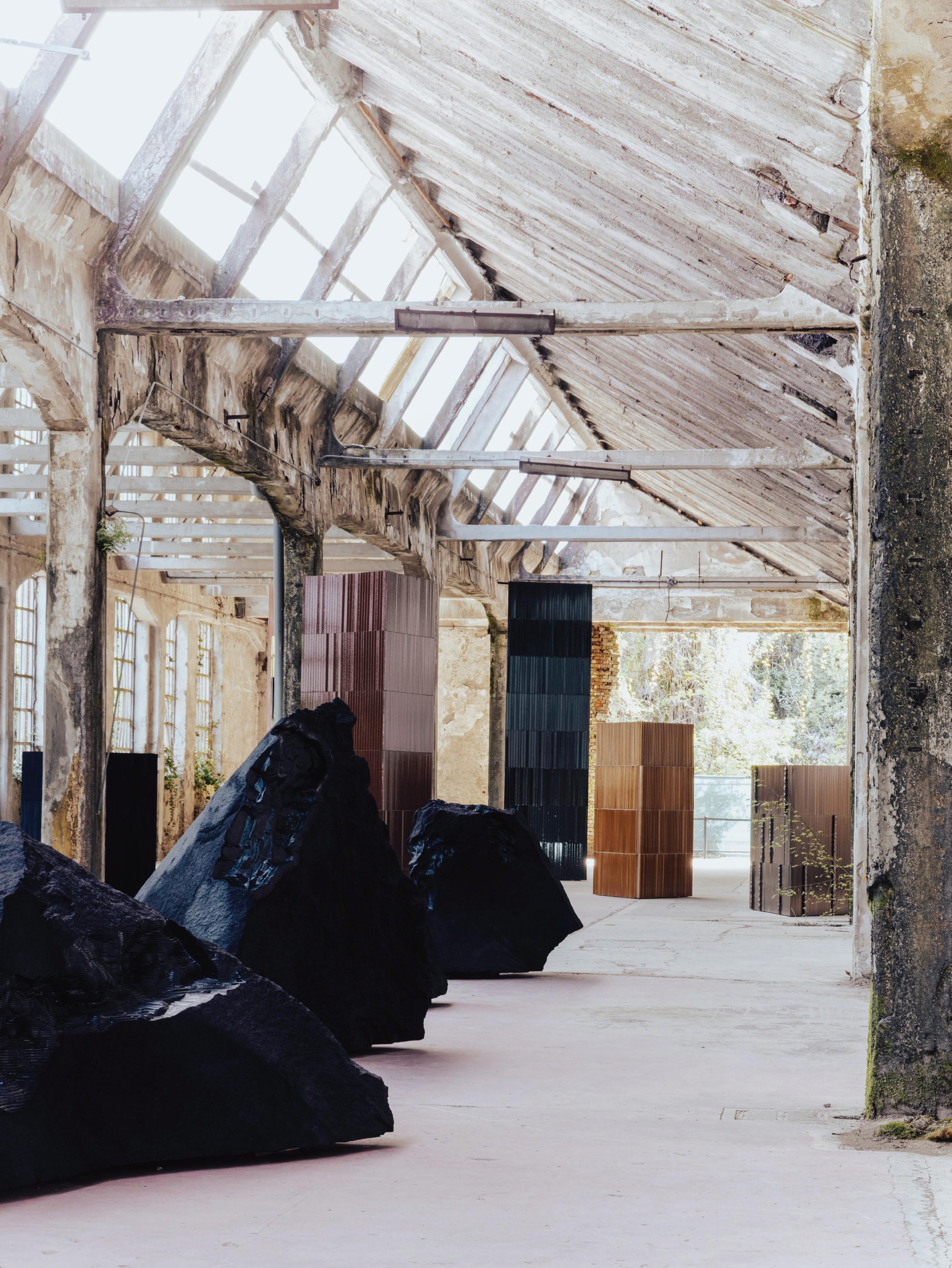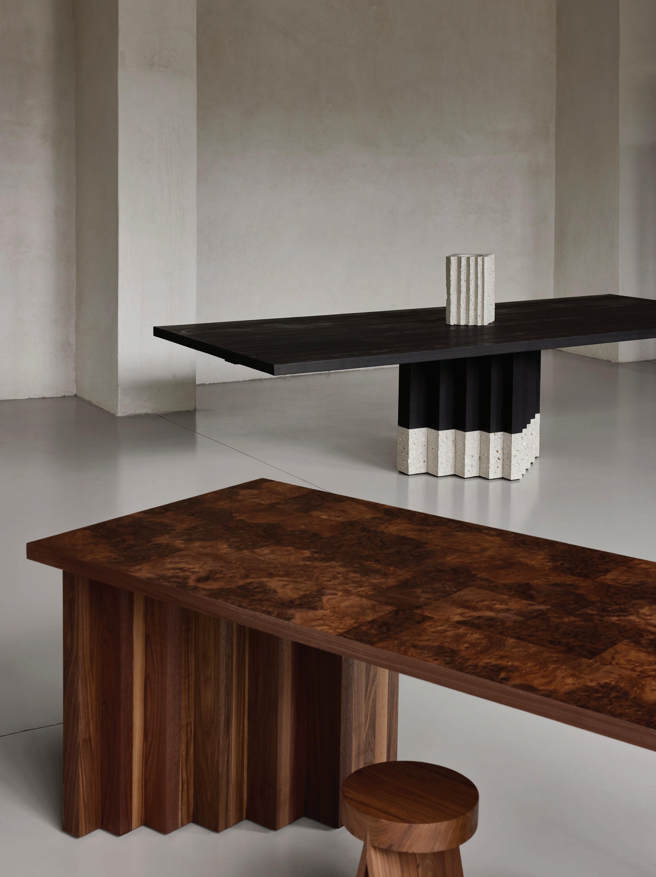 Marking 30 years of his eponymous studio, Christophe Delcourt presented Time Stretched, a snapshot of past products, new designs and collection extensions interwoven with artworks from the Mudima Foundation. Shown here are the OST low chest of drawers, the YOL coffee table in walnut and Black Fusion marble, and the YUG armchair in smoked oak. In the background is Delcourt’s YOA screen in ash and perforated metal.