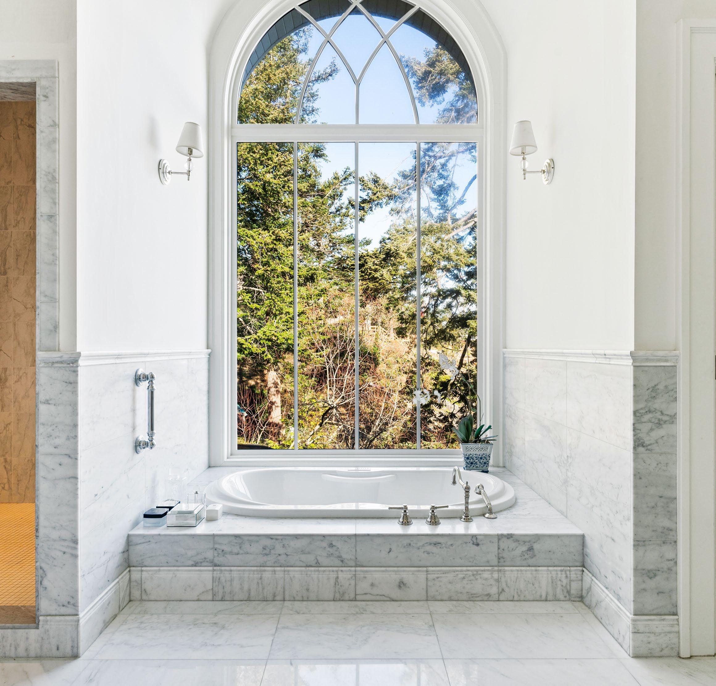 Upstairs are two generously sized bedrooms. The primary bedroom, with large windows, offers views of the garden, while the second bedroom sits more waterfront, offering glimpses of the ocean. Both bedrooms feature ample closet space and well-appointed bathrooms with modern fixtures and finishes.