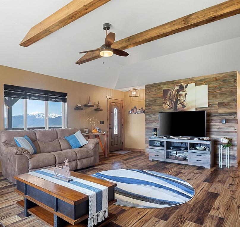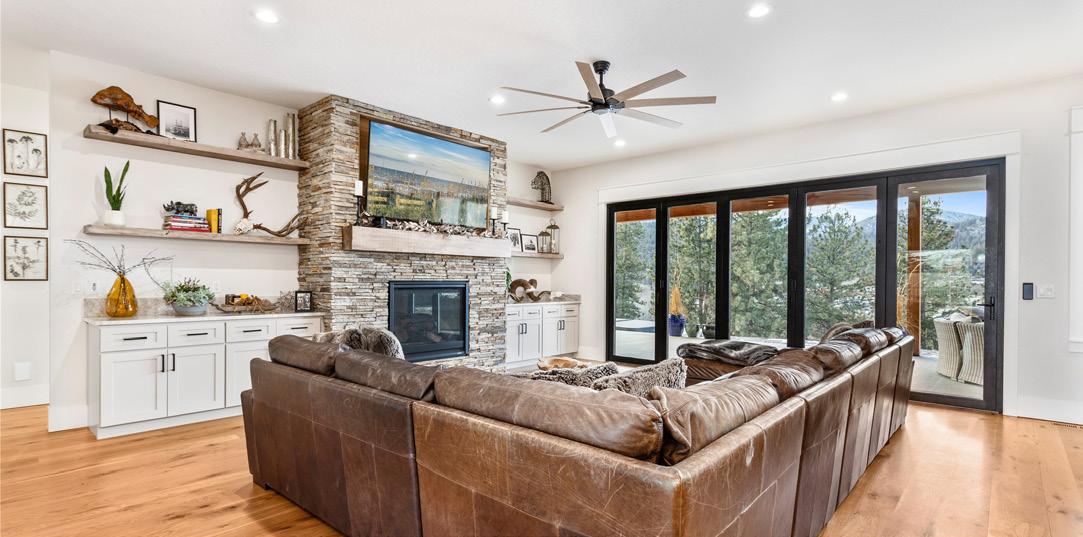 Elevated above the picturesque Bitterroot River, this remarkable property introduces an exquisitely crafted executive home on an expansive 1.12 acre parcel. Merging flawless artisanship with contemporary opulence, this single level residence, which is offered fully furnished, spans an impressive 4,000 Sq. Ft. and encompasses 5 bedrooms and 4 bathrooms. Upon entry, a seamless flow defines the open concept main level, where white oak flooring graces the living room, dining area, and kitchen. The chef’s kitchen stands as a culinary masterpiece, featuring quartz countertops, JennAir stainless steel appliances, a large island with an inviting eating bar, and a convenient butler’s pantry. The living room transforms into a cozy haven, accentuated by direct access to the expansive covered patio.