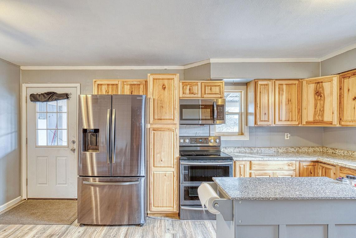 Sellers have made major upgrades since purchasing in 2021! Full kitchen remodel with granite countertops, new cabinets, soft-closing full-length drawers and cupboards. Hammered copper farm-style sink, Moen faucet/soap dispenser. Appliances include stainless steel LG refrigerator, Samsung natural gas stove, Samsung microwave with built-in hood and exterior vent, stainless Bosch dishwasher. Electrical upgrades include new 200 amp service.