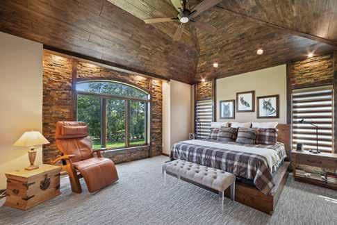 The creative use of natural design applications makes for a stunning first-floor master suite. The high coffered hickory ceiling folds into natural slate transoms on side windows. Slate walls surround a picture window. The combination is spectacular, rivaling what you might find in a five-star cabin resort. The master bath is an authentic spa experience, with a jacuzzi tub and a five-jet massage shower.