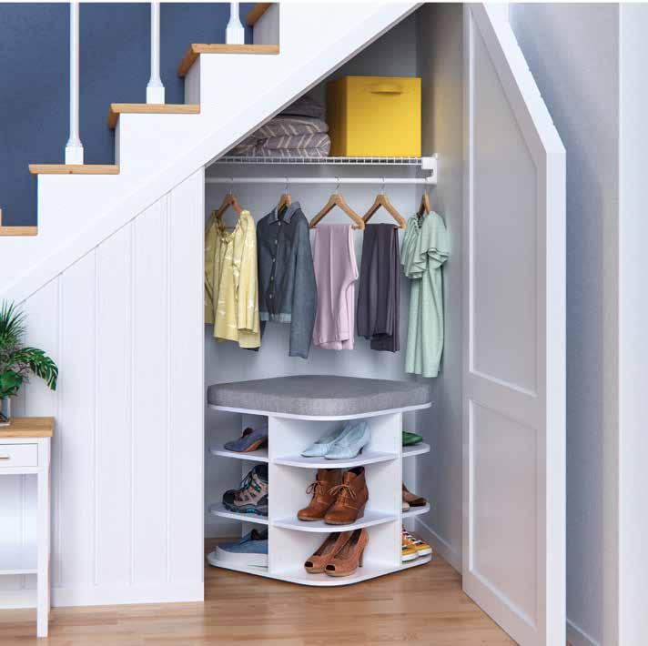 Keep it organized A beautiful closet won’t mean as much for you if it isn’t functional, and organization is a key to functionality. Keep your space organized in a stylish manner with an option like the ClosetMaid Revolution Storage Ottoman, a convenient, easy-toassemble, multi-use piece designed for closets or any area of your home. Able to hold up to 12 pairs of shoes, its rotating design maximizes storage.