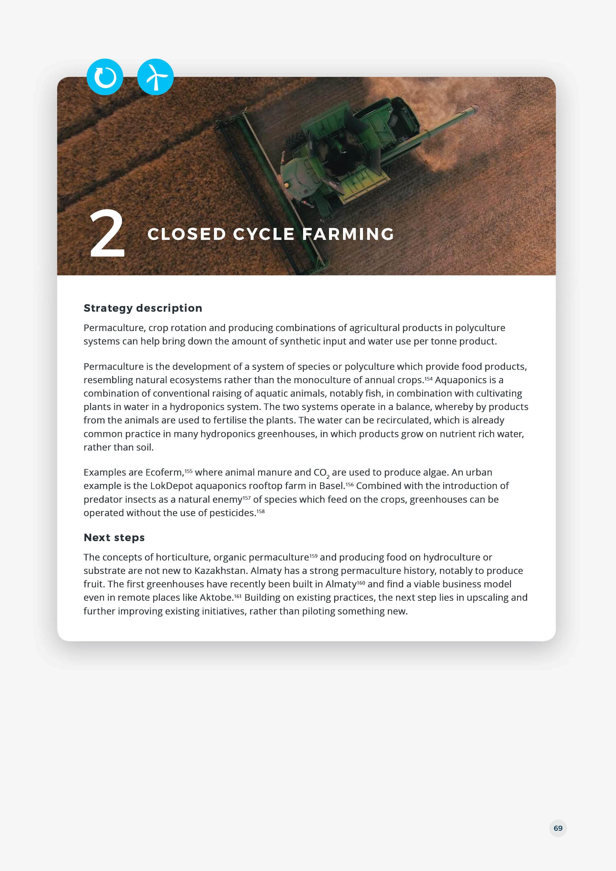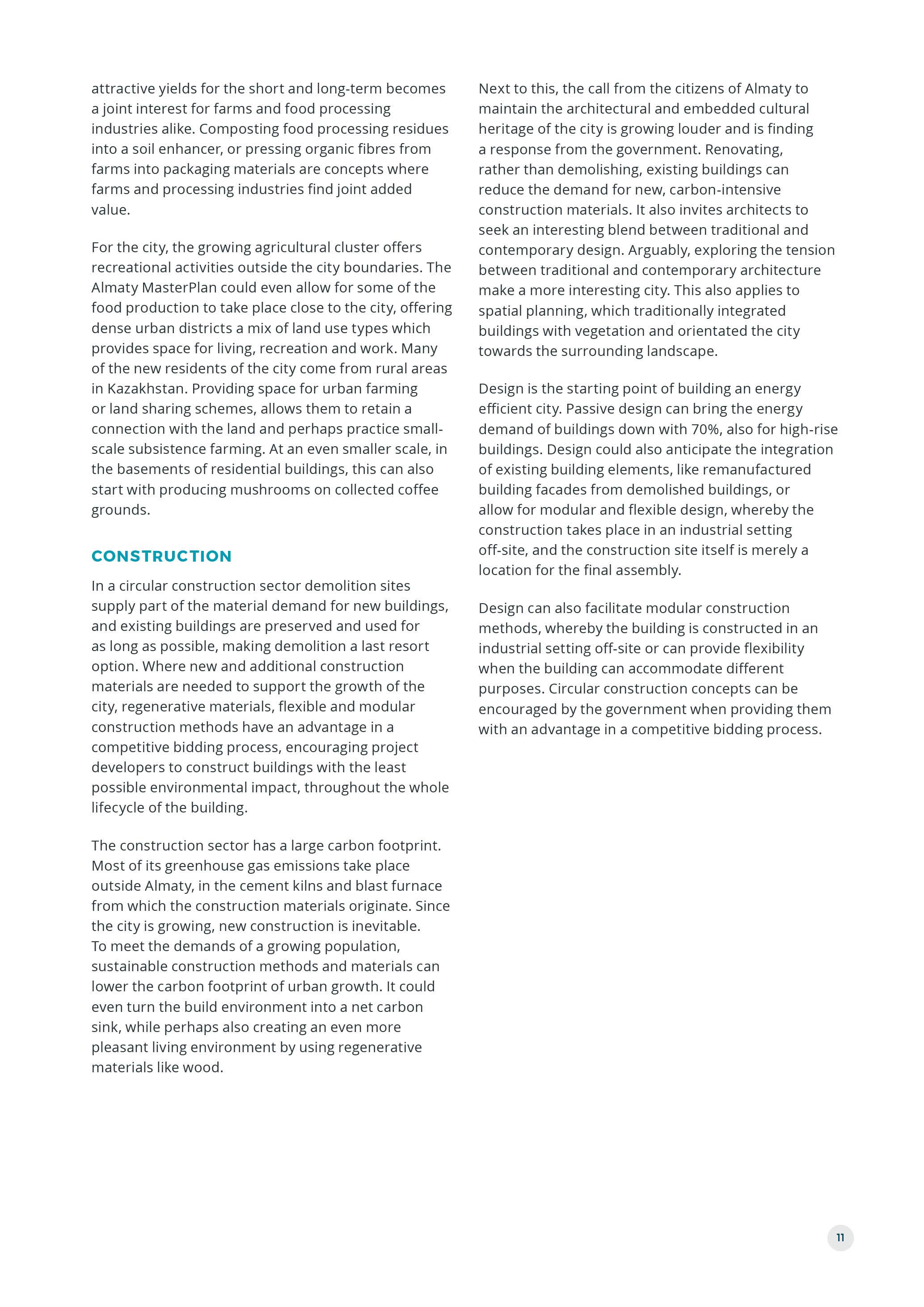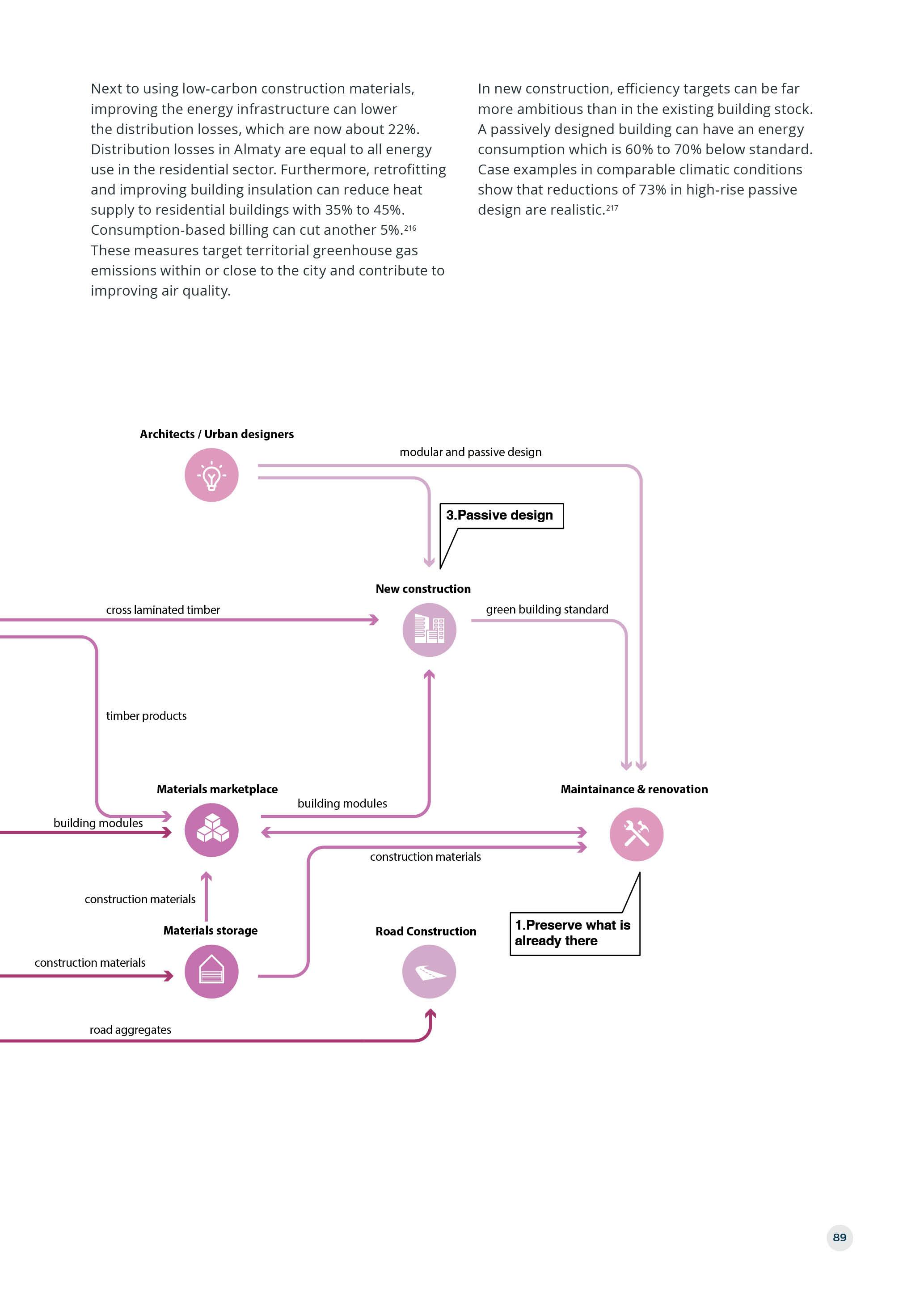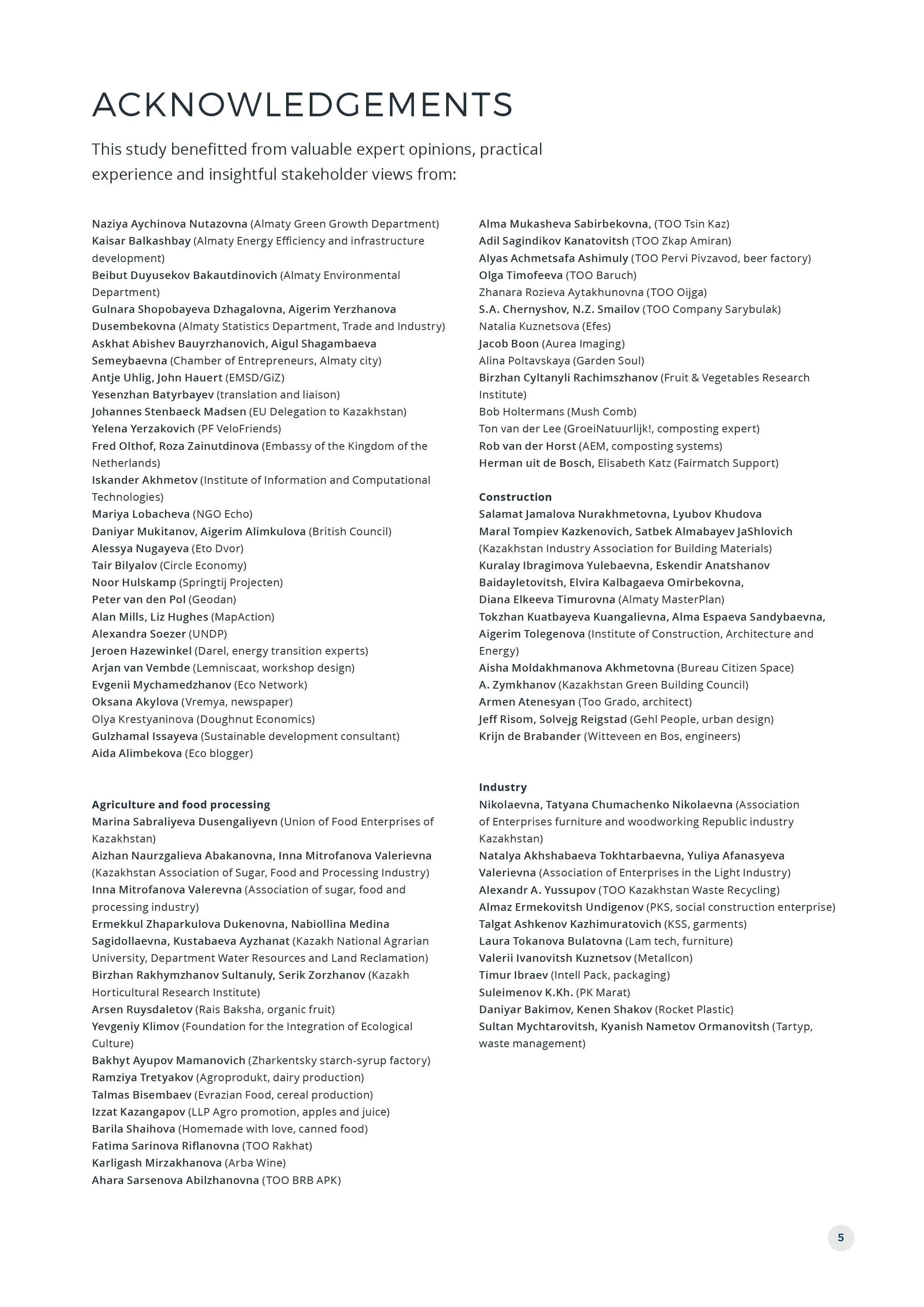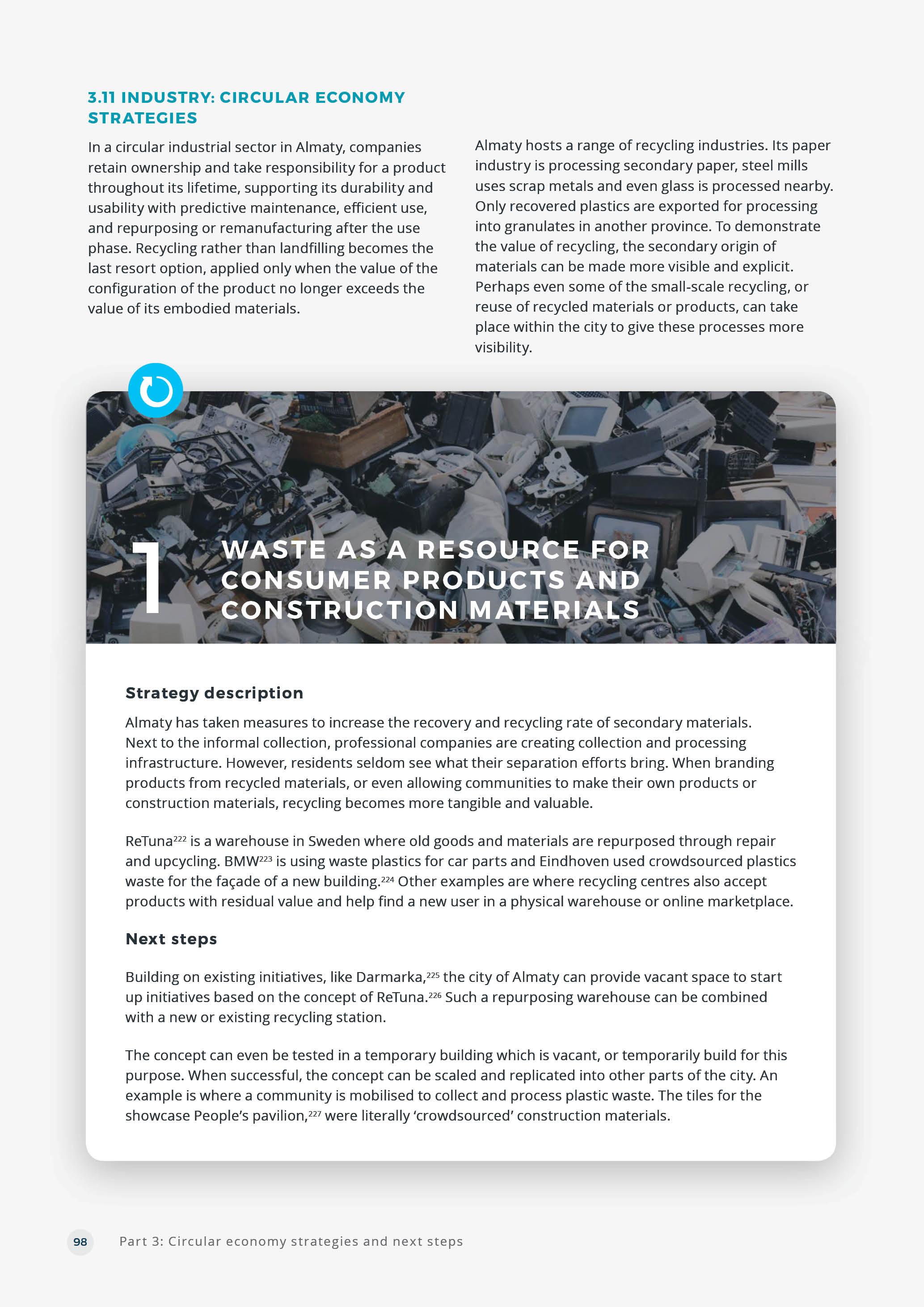 The city of Almaty is the first city in Central Asia which completed a metabolic analysis to identify circular economy opportunities. In a metabolic analysis all resource flows are mapped out, tracing materials from their origin to their usage and eventual destination. Data visualisations show how Almaty uses its material resources and assets to satisfy the needs of its citizens for shelter, nutrition and mobility. The selection of the most promising circular economy opportunities recommendations in the report, relied on the suggestions and recommendations of over 100 experts and stakeholders from the city and their reading of the data. Overviews of existing circular economy initiatives in agriculture, construction and industry show that Almaty is already on the road to a circular future.