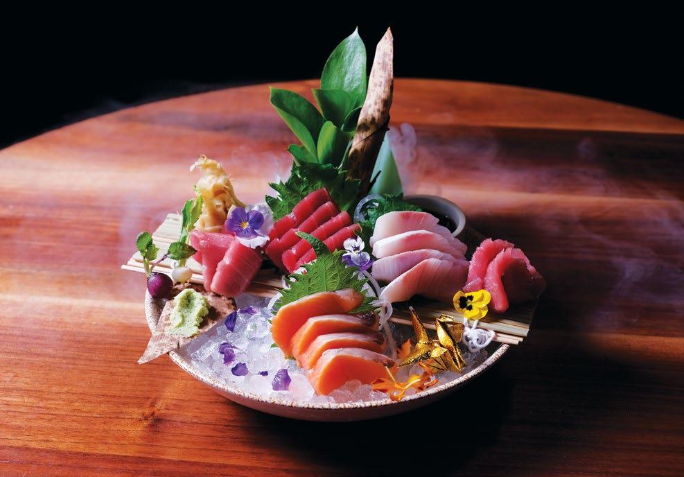 program at Pao,” explained Qui. The Ocean Tower, he noted, focuses on the best fin fish we can get inhouse. It’s a revelation of freshness and flavor, a mélange of salmon, akami, otoro, and hamachi. The Coral Tower, a masterful creation of Norwegian king crab, king crab salad, east and west coast oysters, and wild Australian prawns, “is the best shellfish, from large wild tiger prawns to responsibly sourced king crab and oysters.” A third tower, the Melody, combines Ocean