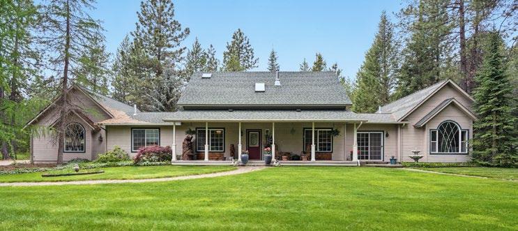 Meadows and Mountains Ranch boasts a stunning custom 5,066-square-foot home with a chef’s kitchen, a corner office with expansive windows, a spectacular log staircase, four master suites, and lovely covered decks. The main floor includes a craftsman-style floor-to-ceiling fireplace, a tongue-and-groove vaulted pine ceiling, and oversized Anderson clad windows. The elegant dining room is conveniently located off the kitchen, and the main-floor master suite includes a jetted corner spa bath with a view. A second spacious master suite with a threequarter bath is also on the main level. Upstairs, two more master suites feature private decks and three-quarter baths, connected by a charming catwalk and sitting area. The home and three-bay shop sit on 19 acres, alongside the original 1927 guest quarters. An additional 10.51 acres includes a two-bedroom, one-bath home; a scenic barn, Cutter Creek, and more. The property offers a beautiful mix of pasture and timber with both privacy and open space. All of this is just minutes from the quaint town of Noxon, MT.