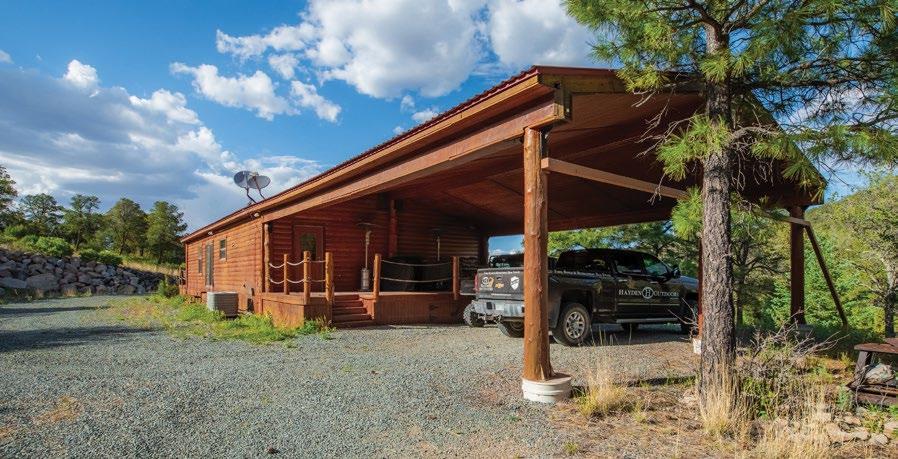 three-and-a-half bathrooms, a large kitchen, dining room, and living room. The 2,000 square foot guest cabin is a unique, one-ofa-kind wooden cabin made from hand-hewn timbers and boards, all taken from the ranch. This two-story cabin has six bedrooms, two bathrooms, an open living and kitchen combo, and beautiful beams throughout. There is a deck with views of the pond and lake in the distance. Additional improvements on the ranch include a 4,000-square-foot shop building with rollup doors, a 6kW hydroturbine fed via spring water, and 48 solar panels.