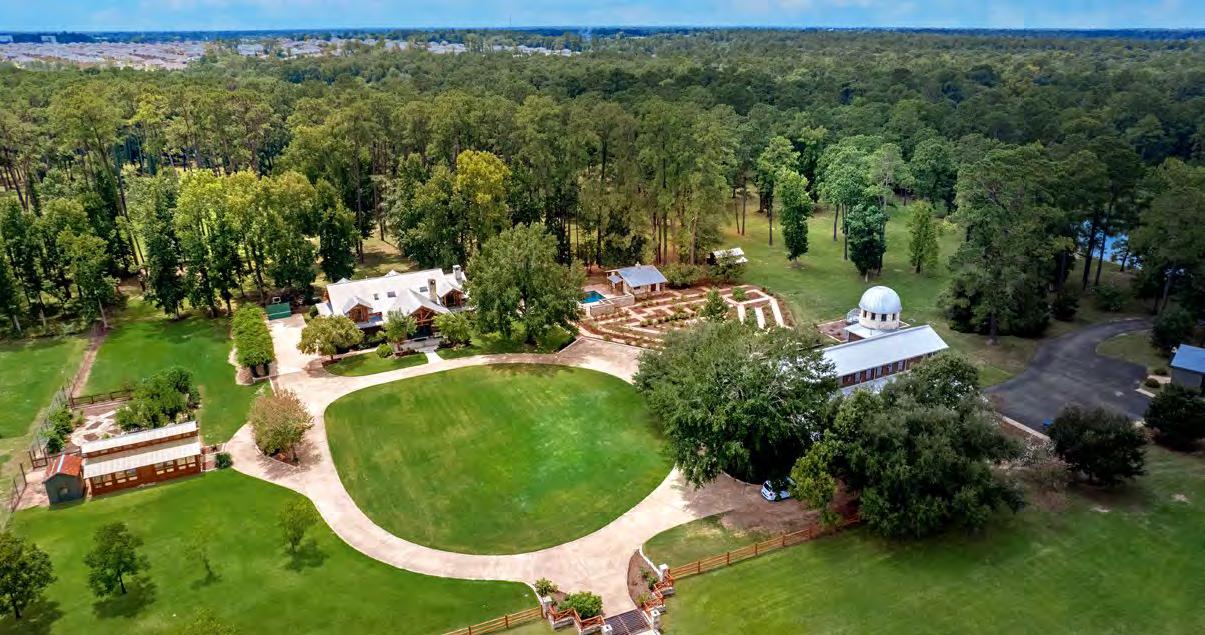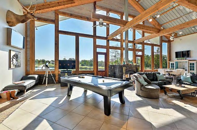 Picturesque 100-acre estate lined with majestic oak trees and two ponds in Hockley! A gated entry leads you to the main home—a stunning log cabin with a circular drive, three car garage, walnut hardwood flooring, a gorgeous kitchen, a game room plus a family room, three bedrooms, and an open concept for entertaining. The sparkling pool and spa offer an adjacent pool house with a wet bar and fireplace. A 7,000-square-foot barn with A/C and heat is ideal for hosting events, a homebased business or could be converted back for horses. There’s a greenhouse, three water wells, a rose bush maze, and a separate dog cottage. Two additional guest houses are on the property—one has two bedrooms and a full bath, and the other offers one bedroom/ full bath. Both have kitchens and washer/dryer hookups. There are fenced-in sections for livestock, and these owners can offer ag exemption for cattle. This can be used as a homebased business, wedding venue, or a magical place to call home! $5,250,000.
