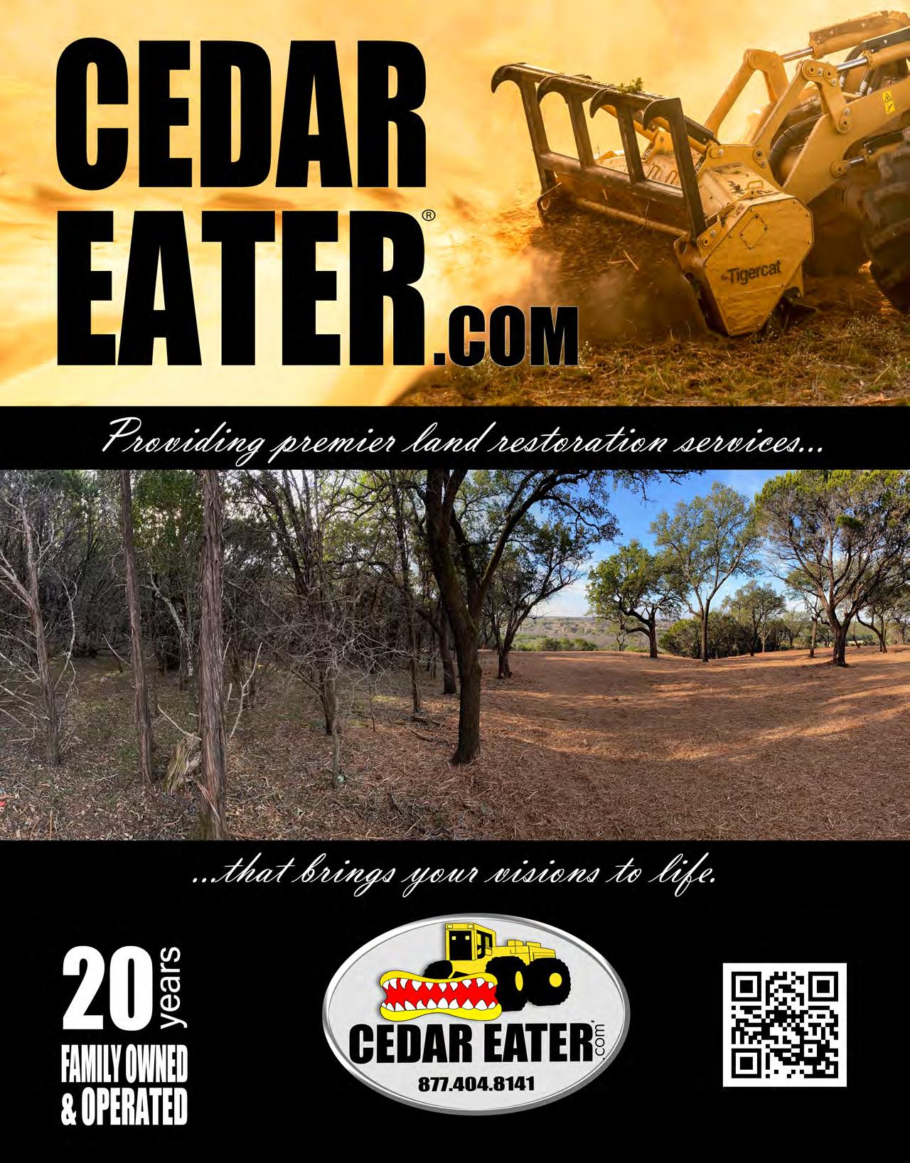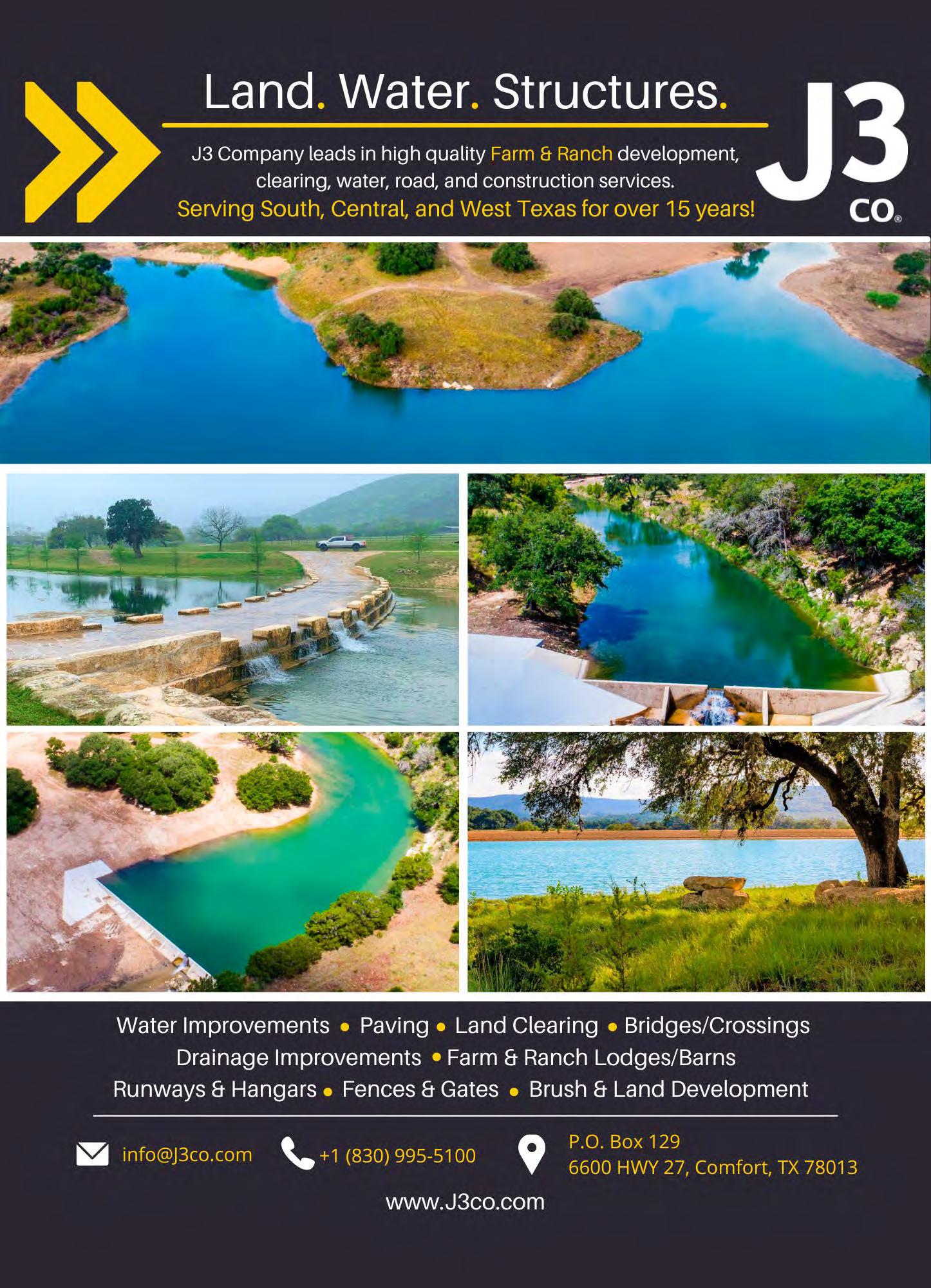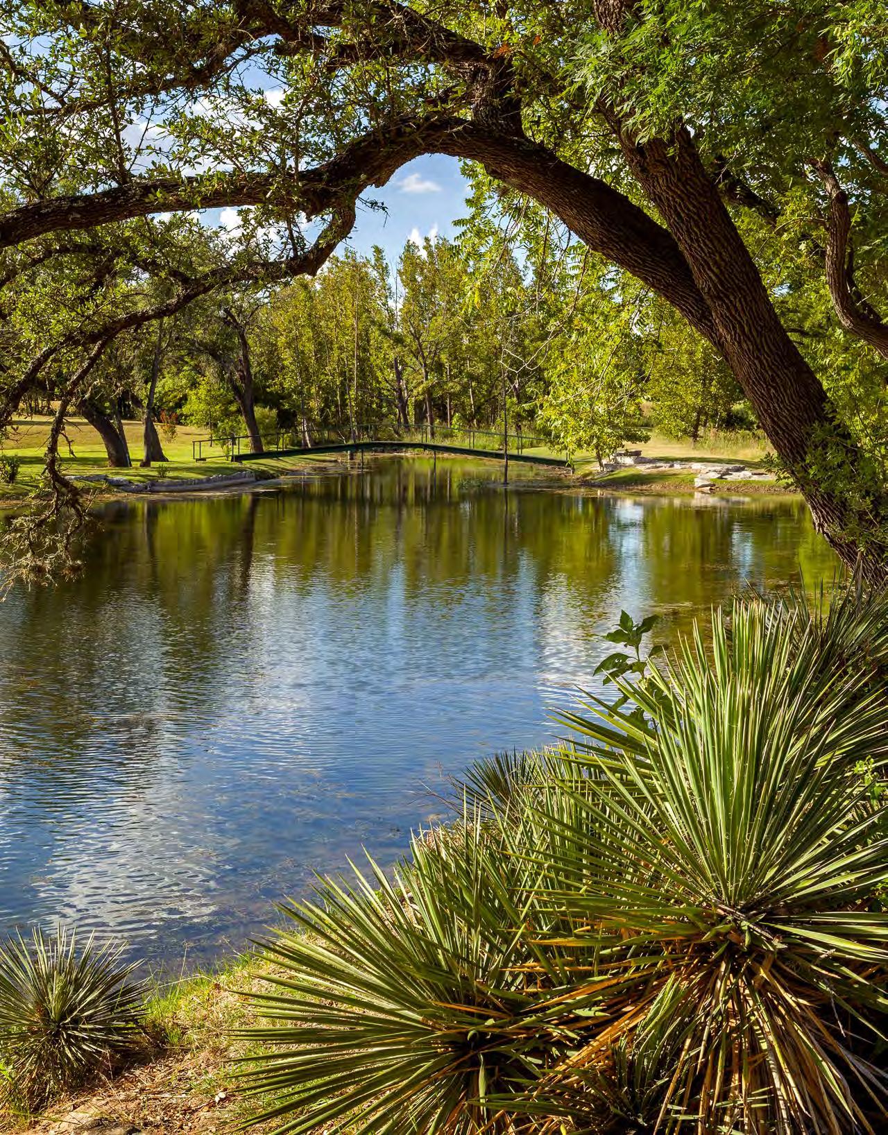 T he Enlightening Ranch is a 302.22acre, high-fenced hunting getaway in the Kerr County Divide area. The land is suitable for cattle, horses, sheep, or goats. Two hunting cabins are currently being renovated. A submersible well supplements a stocked pond and the water troughs. An intense cedar clearing project has been under way and several Indian mounds have been located, as the ranch borders an 11,000±acre ranch near the North Fork head of the Guadalupe River. This is a highly desired area, featuring water, wildlife, beauty, seclusion, and proximity to the amenities of Kerrville, TX. $2,871,090. Bill Barton, Broker-Assoc.