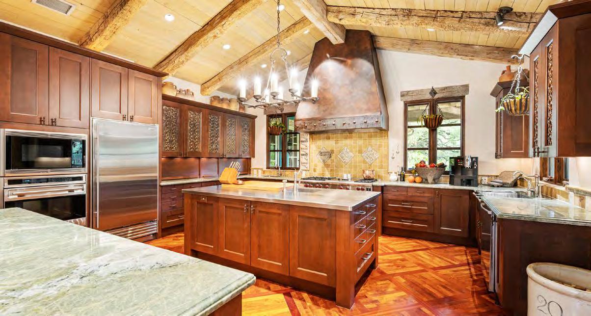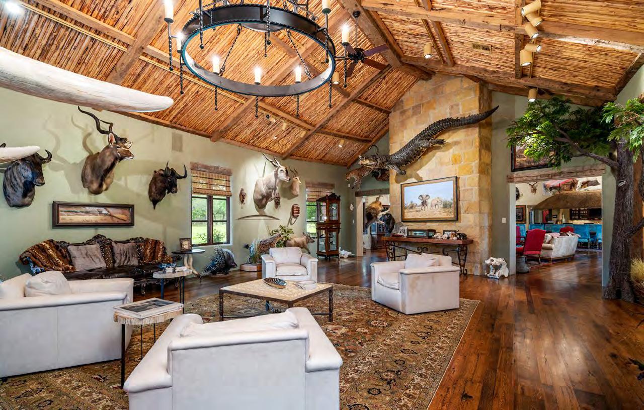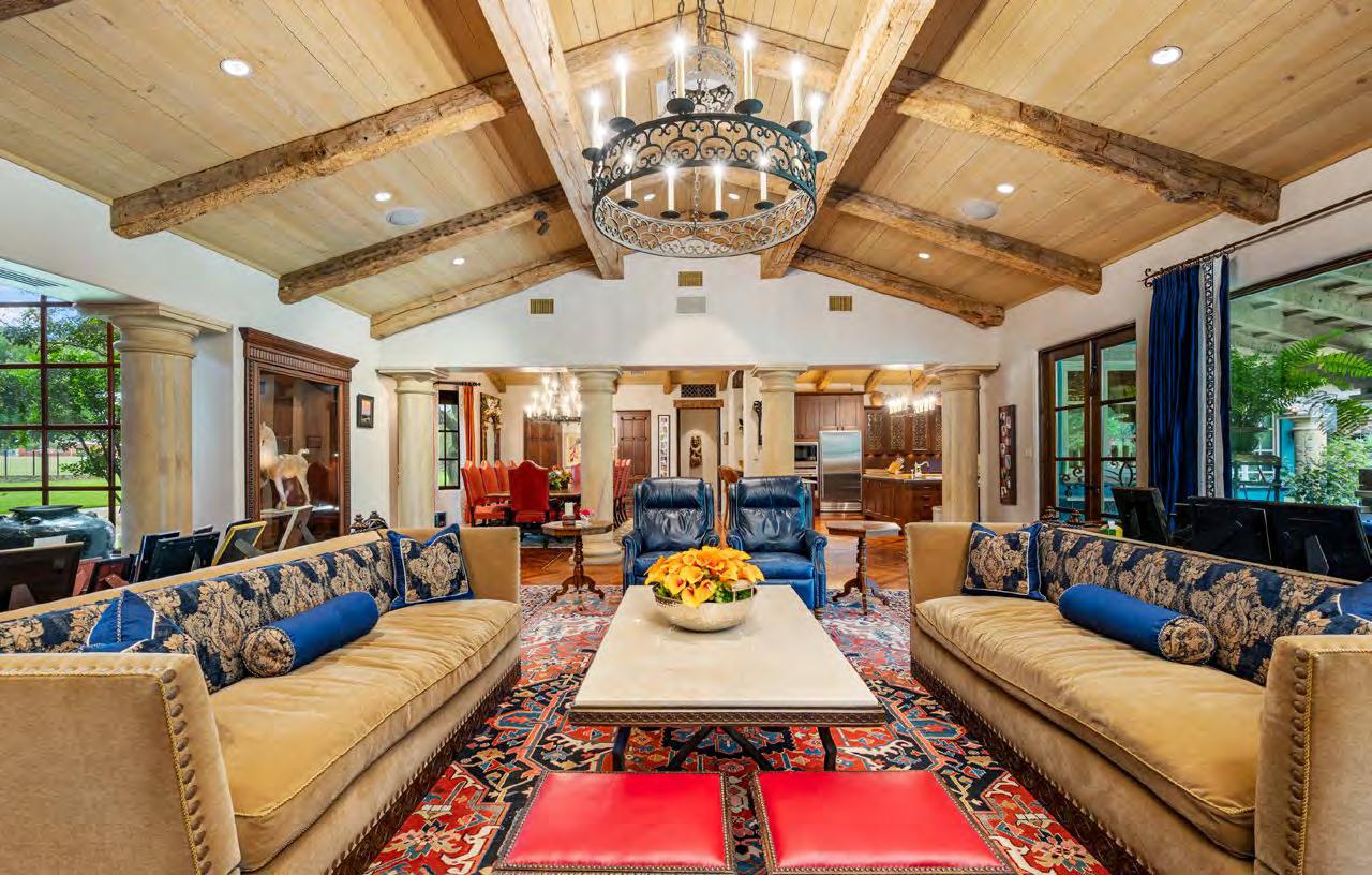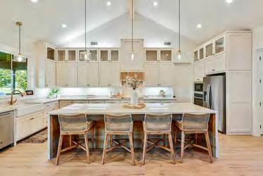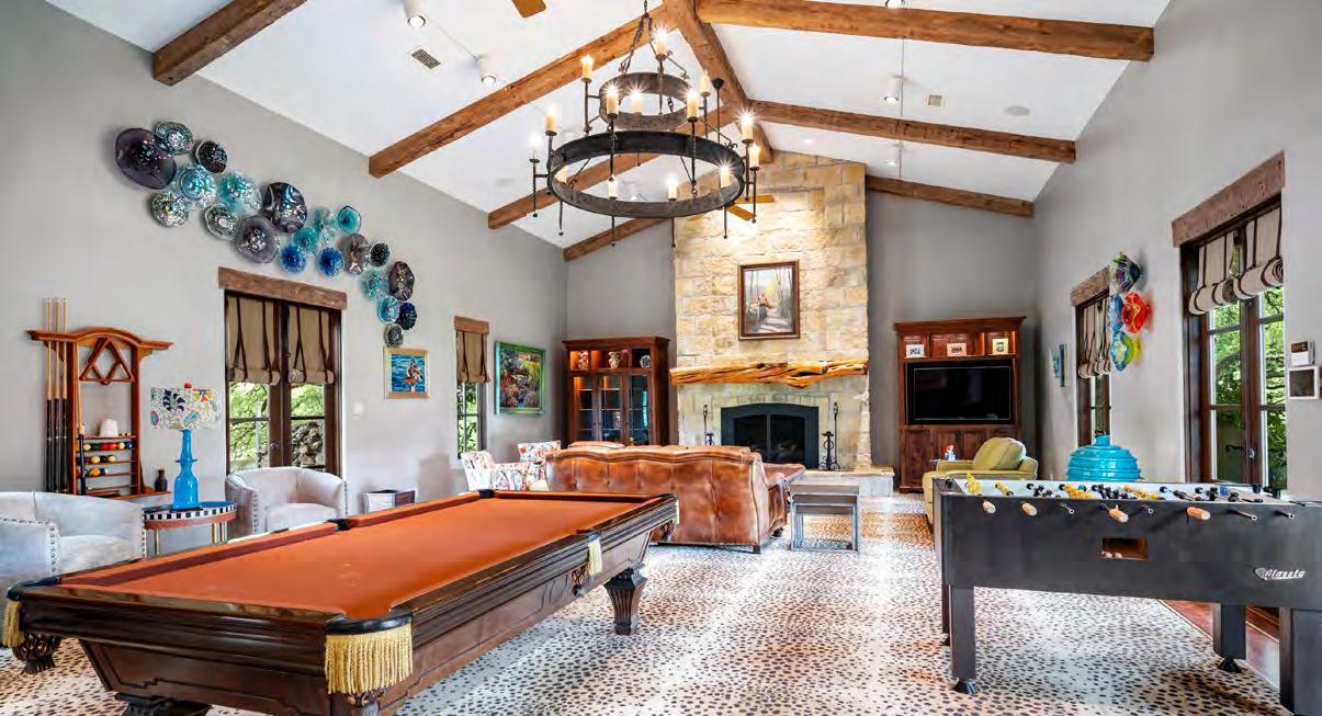Located on five lush, wooded acres in Red Oak Ranch, this one-story custom home is every equestrian’s dream! Enjoy direct access to miles of dedicated horseback riding trails. Highlights include a gated entry, five-car garage, double circular driveway, a new roof, water well, new LED lighting, and wheelchair accessibility throughout the house. Additional features include a lavish formal dining room with adjacent butler’s pantry and a wood-paneled study with an attached separate study. A magnificent sunroom has views of the beautiful pool and a dual-sided fireplace. The owner’s retreat offers a relaxing bath and bonus room, ideal for a home gym. The chef’s kitchen has a LaCanche gas range, ice maker, wine grotto, built-in Miele coffee maker, and pot filler, plus it opens to the breakfast room and den. Four additional bedrooms with walkin closets and two separate apartments are attached to the garage. The private fenced backyard features a covered patio, outdoor kitchen, gorgeous pool, and four-stall barn with tack and feeding room. There is a wellmaintained riding arena available exclusively for owners. $2,675,000.