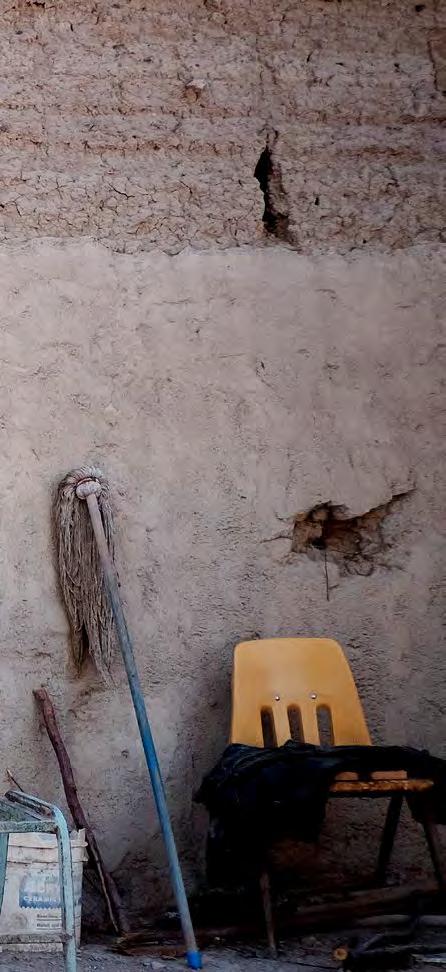 bigger problems. Concrete was introduced into adobe construction throughout the Southwest at the turn of the twentieth century. It was thought to improve the building system, making it maintenance-free, and indeed, nearly all adobe buildings in the Big Bend involve some addition of concrete in the bricks, mortar, or plaster, if not all three. Concrete, however, can create moisture problems, as evidenced by the long gash at our house. Adobe’s enemy is moisture. “They could not be more different, concrete versus adobe,” says Miguel Mendías, a multidisciplinary artist with a strong interest in earthen construction methods. “Concrete is rigid. Once it cures, it will never reverse. Adobe is malleable. You can work and rework it. Like bonds to like, dirt bonds to dirt.”