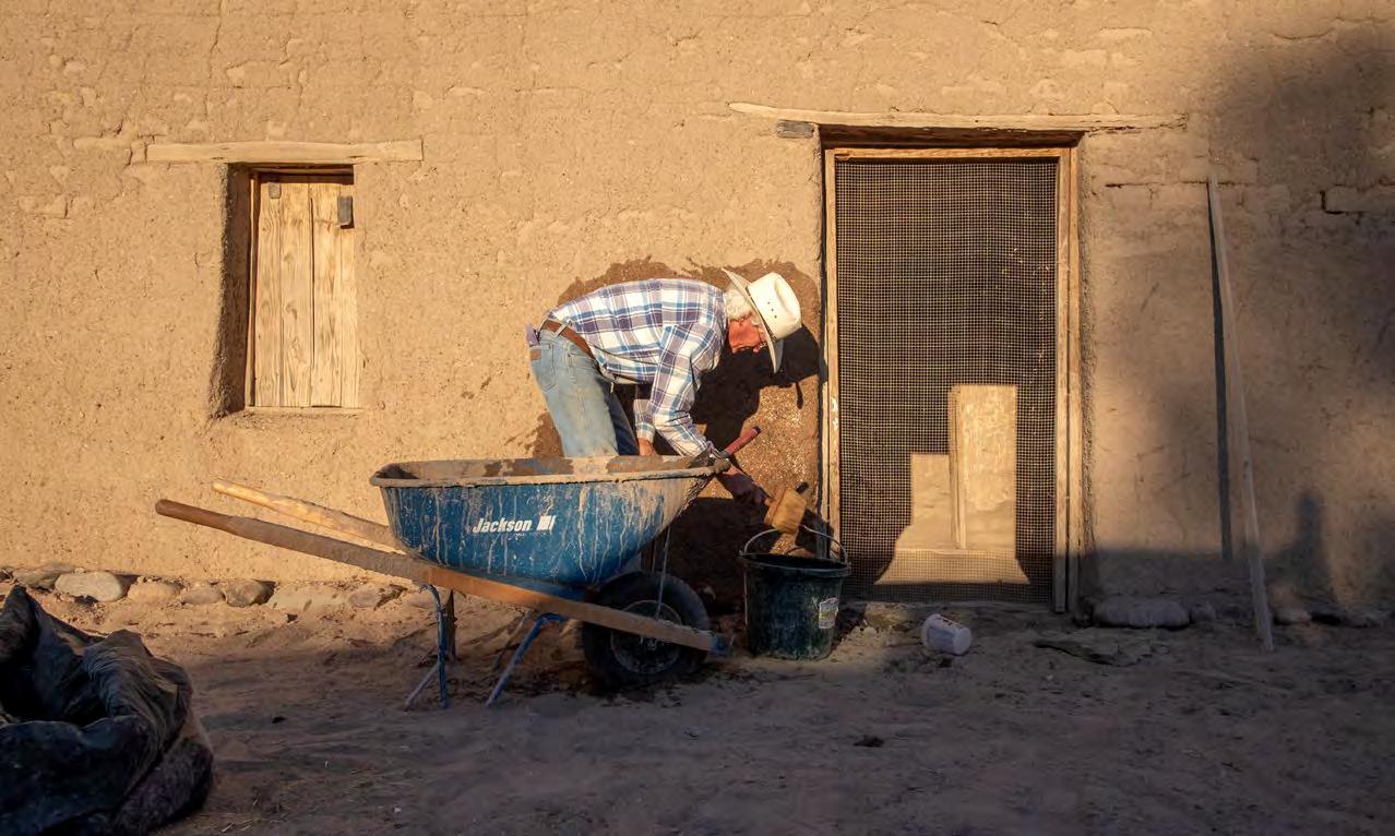 Adobe is deceptively simple, for it is, after all, just dirt, straw, water, and sun. Yet its nuances are complex enough that the most experienced adoberos, like Jimenez, are called maestros, evoking both the mastery of the craft and an element of teaching. It’s learned by doing, by hands-on knowledge that’s passed along by those who can feel the mud within their fists and know that it’s the right stickiness and consistency to pour into forms or slather onto walls. People meet