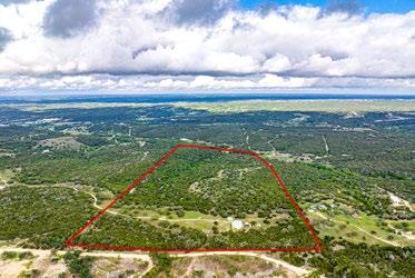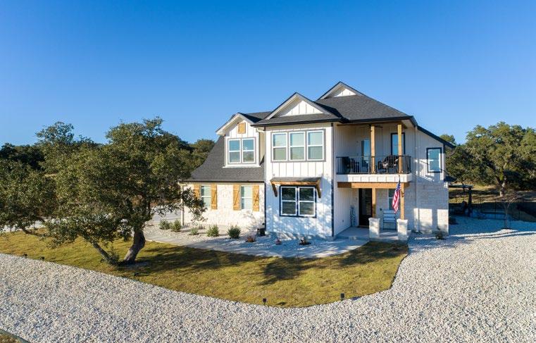 Big Texan Sky has everything you could want in a Hill Country home. The main home consists of two bedrooms and two-and-a-half baths, while its floor-to-ceiling windows overlook the eight-and-one-half AG exempt acres. Careful thought went into the design aesthetics while creating this “Hill Country Modern” home. The style extends to the native landscaping and outdoor entertaining areas that feature a stoneencased spa, perfect for enjoying the sunset, and a fire pit for hosting larger parties. The sellers have cleared a nature path for ease of exploration on the property. A massive 26x40foot garage offers space for three cars, while its features include epoxy shield flooring, an insulated and automatic glass garage door, and 22x14-foot living quarters appointed with every feature a visiting guest might need. Big Texan Sky has been operating as a vacation rental for several years with incredible reviews. This could continue as an income-producing property, or a personal retreat surrounded by breathtaking views. $1,995,000.