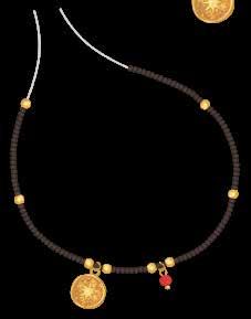 3. Enfiler à nouveau 1 perle dorée, 1 noire, l’anneau de la perle à facettes rouge, 1 perle noire, 1 dorée et 20 noires.