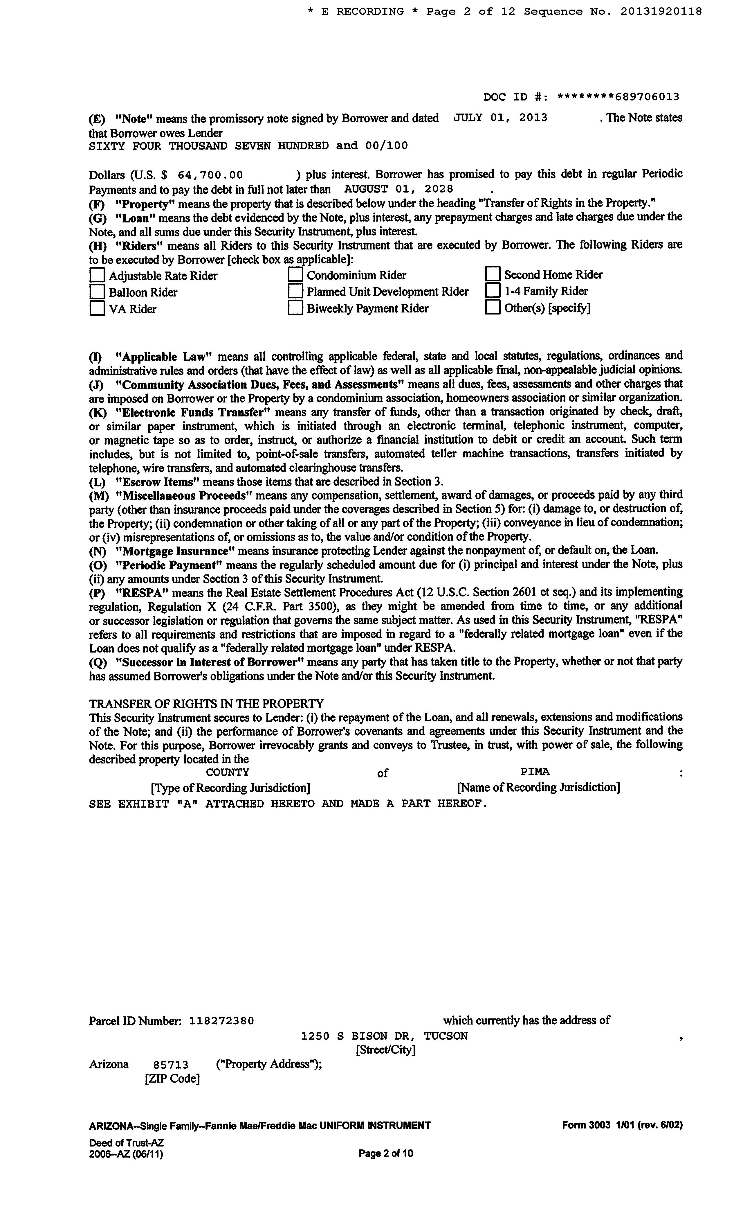 Mailing Address : 1250 S Bison Dr, Tucson AZ 85713-1246 C024