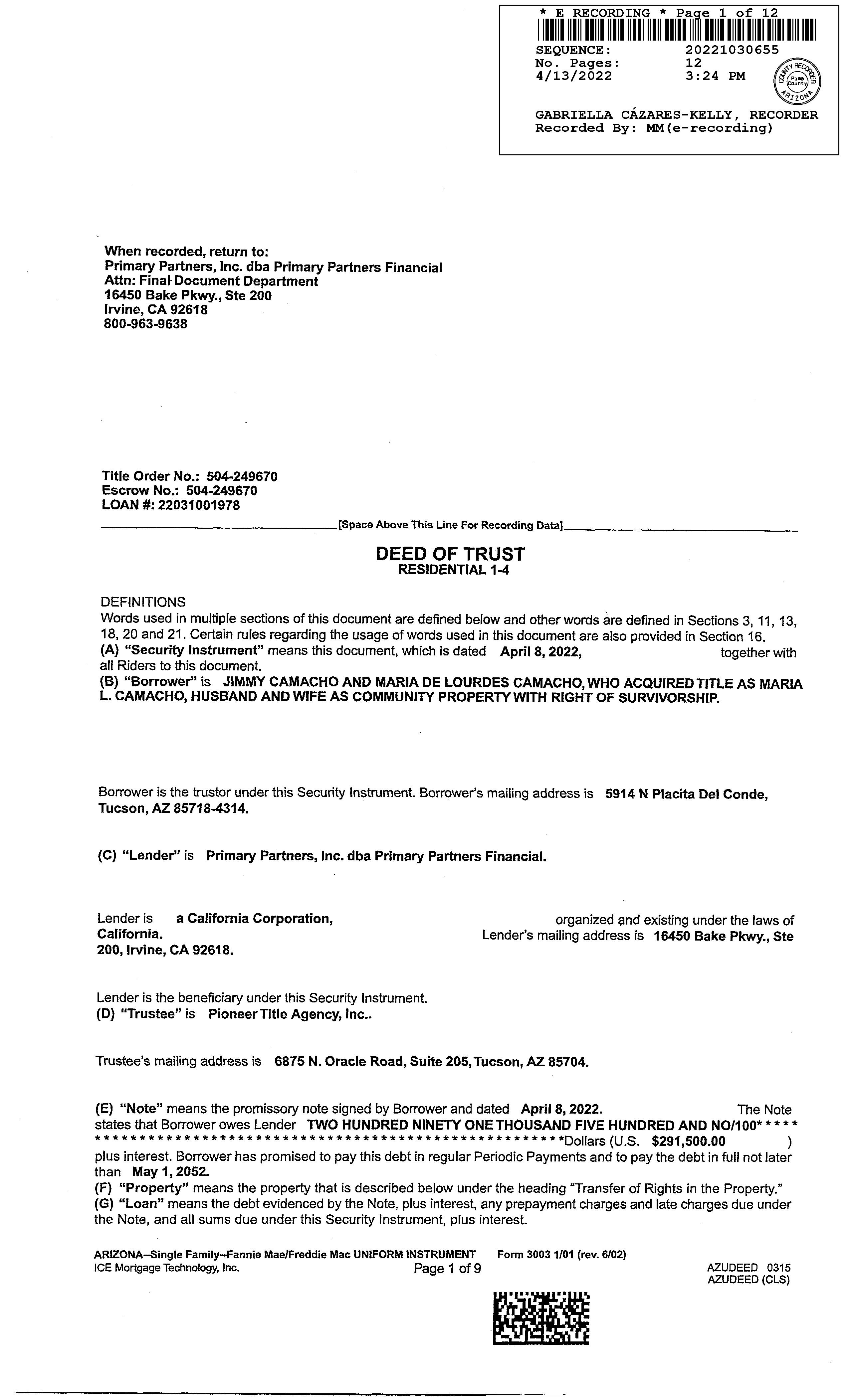Owner Name: Camacho Jimmy /Camacho Maria L APN / Alternate APN: 109-06-2300 / Deed Type: Warranty Deed