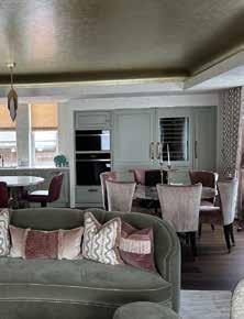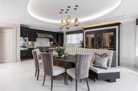 and wine cabinet stand proudly as a statement feature. Framed in natural marble and bronze, and crowned with a furniture-style cornice, the appliances sit behind custom mirrored doors etched with a refined sunburst motif. More akin to crafted furniture than conventional kitchen cabinetry, this bespoke feature creates a moment of drama in a way that feels entirely individual. This kitchen doesn’t simply live within the house; it is an extension of the interior and architecture. It’s a timeless space where the legacy of style meets the needs of modern family living.