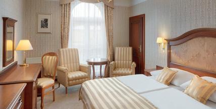 ZIMMER 115 Zimmer und Suiten, mit DU o. Wanne/WC, Bidet, Sat.-TV, Telefon, WLAN, Föhn, Safe, Minibar, Kaffee-/Tee-Set, tlw. Balkon o. Loggia, Bademantel, Slipper. EZ=DZ. Standard (Kleopatra, Carlton, Rusalka), Rooftop View (Savoy) mit Terrasse. Superior (Savoy, Artemis, Kleopatra, Carlton), Deluxe (Savoy, Kleopatra, Carlton) mit vergoldeten Luxusmöbeln. Juniorsuite (ca. 55 qm Carlton) mit 2 Bädern, 2 sep. Toiletten, Blk. ca. 21 qm. Suiten und Appartements auf Anfrage. Lift.