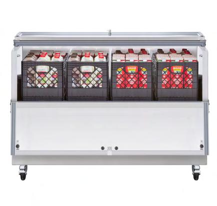 The compact all stainless-steel 58-inch-wide milk cooler is a low maintenance solution for milk crate cooling and storage for school cafeterias. This commercial milk cooler is durable and energy effcient; engineered with a urethane foam insulated door and walls and using ecofriendly R290A hydrocarbon refrigerant. The cold wall construction keeps the temperature consistent at 36°F to 38°F (2°C to 3°C). The interior and exterior of the cabinet are constructed of durable stainless-steel that protects milk bottles, cartons or crates and is easy to clean. The unit provides a storage capacity of (16) 13”x13”x11” crates or (10) 19”x13”x11” crates. The fip top lid and fold down door allow students, teachers, and food service personnel to access fresh, cool milk with ease.