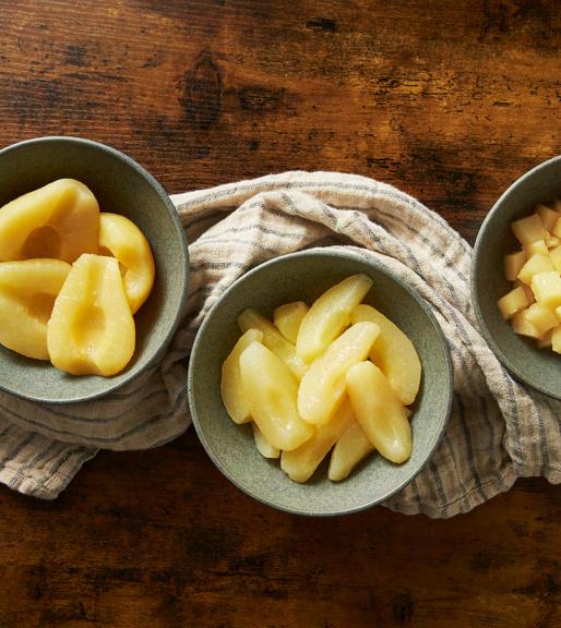 Pacifc Northwest Canned Pears are versatile and ready to use in recipes or enjoyed straight from the can. Bartlett pear trees—an heirloom pear variety that has the perfect sweetness and texture for canning—thrive in ideal growing conditions in the Pacifc Northwest. After being harvested by hand, pears are delivered to nearby canneries where they are carefully ripened, peeled, cored—and halved, sliced or diced—before being poached in juice or sweetened syrup, right in the can. This time-honored canning process keeps pears ripe, juicy, and ready to eat. Buying canned pears from the Pacifc Northwest supports American agriculture and food grown on family farms. Check the label for “Product of the USA” to be sure you’re getting the highest quality.