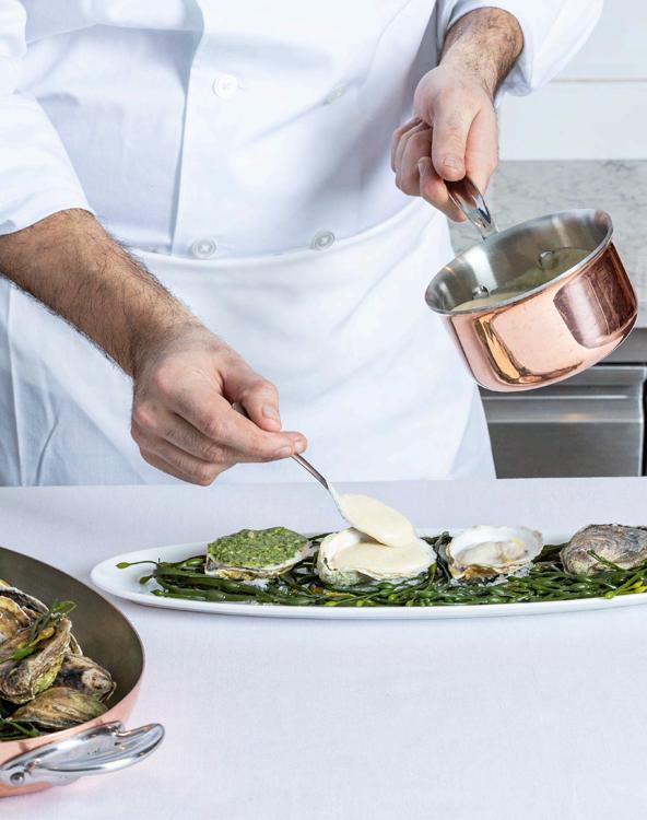 Lunch and Dinner Favorites: Pan Roasted Salmon & Warm Brussel Sprout Salad ,caramelized cipollini onions, toasted hazelnuts, bacon, hazelnut vinaigrette), Pasta Aglio y Olio ( bucatini, gulf coast wild prawns, parmesan & lemon), Steak Frites ( 10 ounce center cut steak, french fries, pea shoot salad, chimichurri)