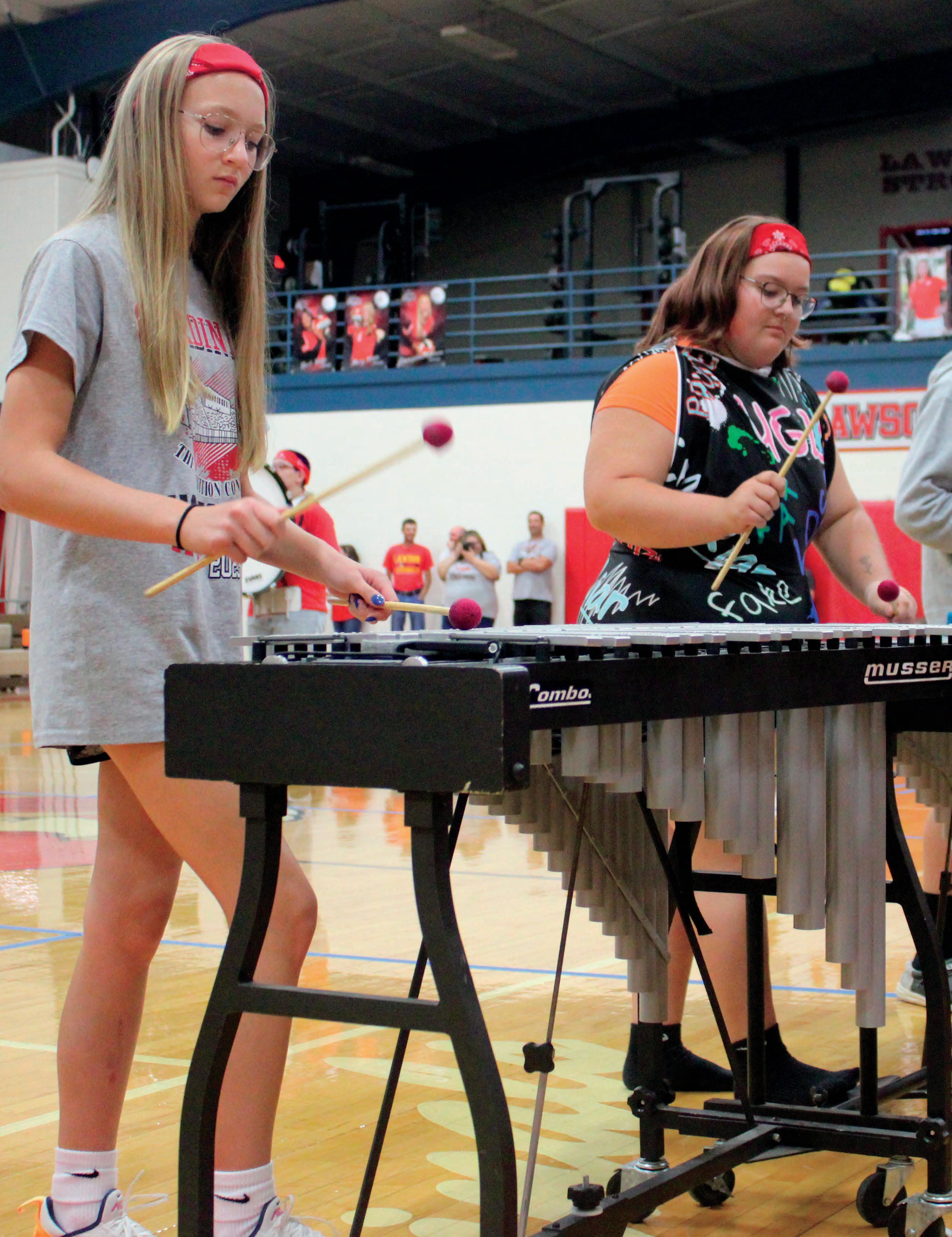 Freshman Elena Mason and junior Makynzee Hubbard play the vibraphone during the drumline performance at the homecoming pep assembly Sept. 22. Photo by Karen Johnson
