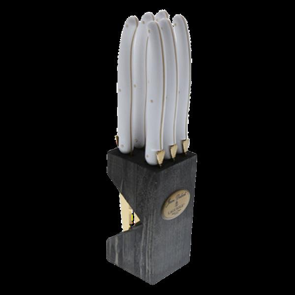 Elevate your entertaining with Jean Dubost’s heavy gauge flatware in elegant Ivory with Brass accents. This stunning collection includes a 20-piece flatware set, a two-piece cheese set, and six steak knives, all in a gorgeous wooden box. Perfect for those who love to entertain with flair, this collection combines functionality with timeless beauty. Impress your guests with Jean Dubost.