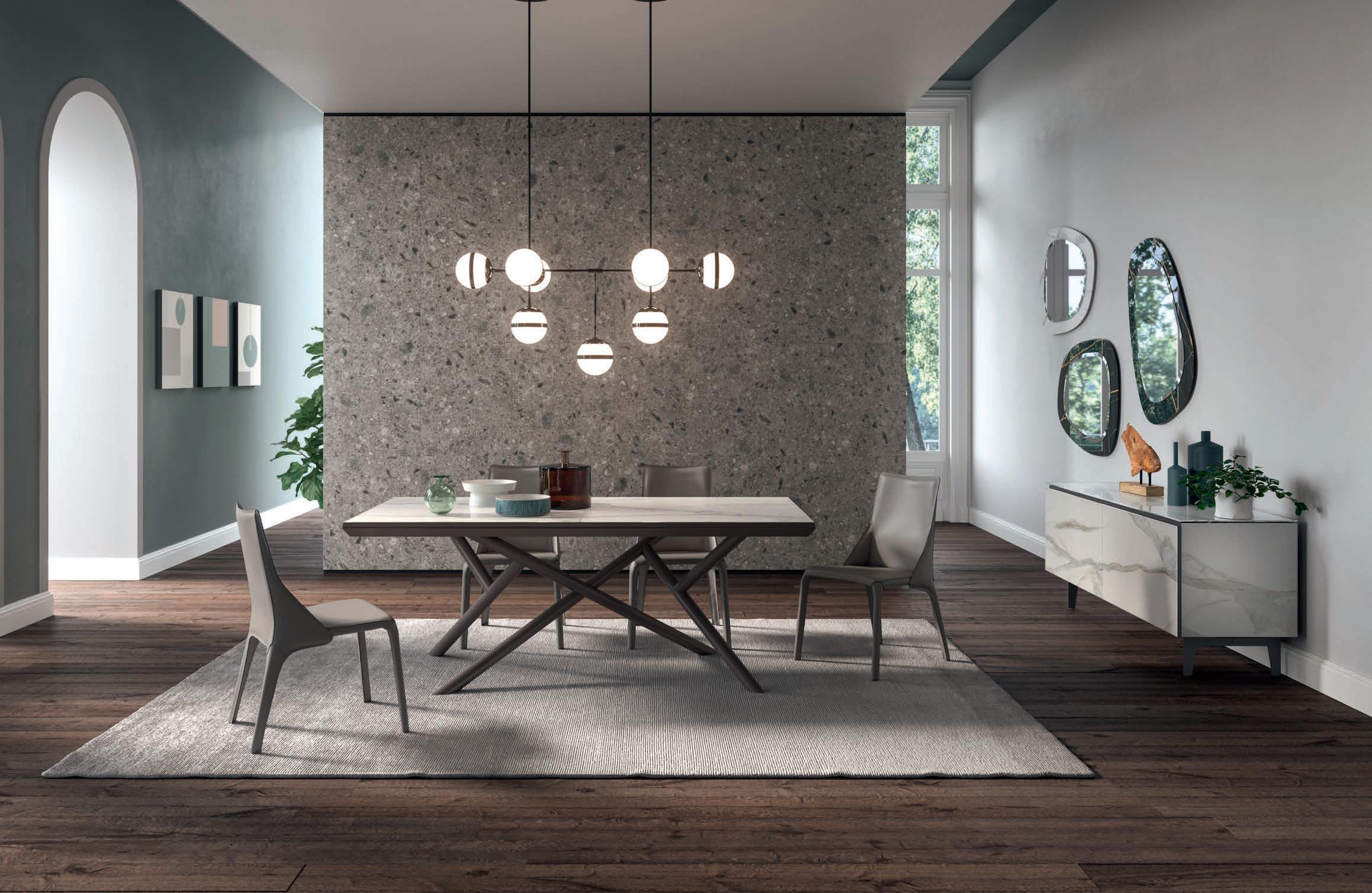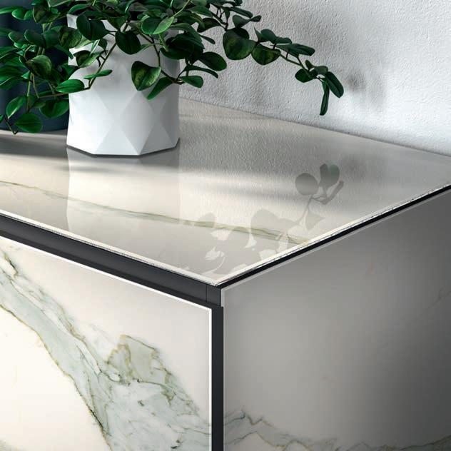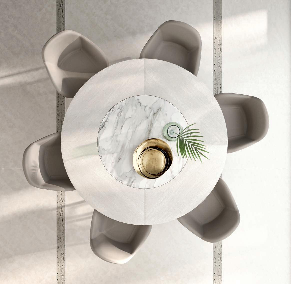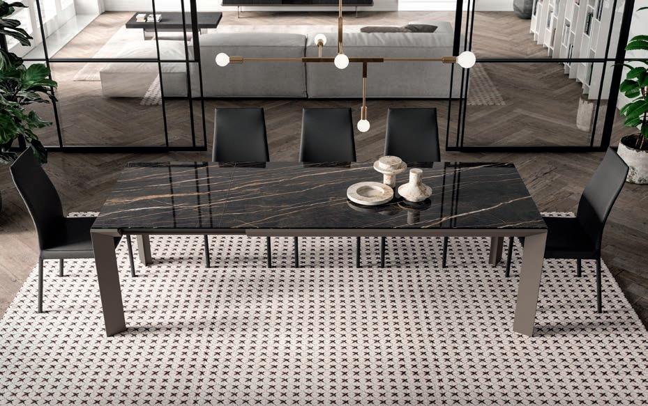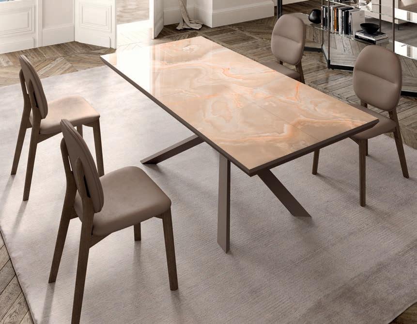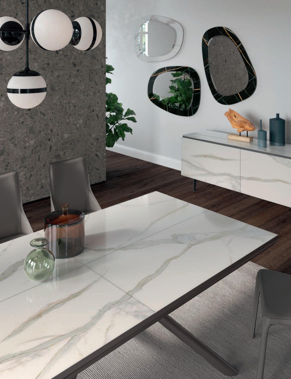 Il top di alcuni tavoli così come diversi piani e ante delle madie della collezione OZZIO ITALIA sono rivestiti in ceramica o Marble Glass. ue materiali di valore, per superfici compatte e monolitiche, dal mood naturale, c e ri ettono la luce dell’ambiente ed esprimono tutta la ricercatezza di un lusso quotidiano che esalta il design dello spazio.