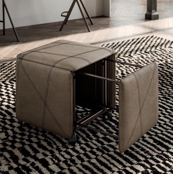 Leather is particularly suitable for the covering of furniture as it is warm and protective in winter, cool and not sticky during the summertime. A precious material that enhances nuances and re ections and gain more value as it ages, bearing the hallmarks of the time.