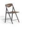 Sedia pieghevole con struttura in metallo, sedile e schienale in legno.
