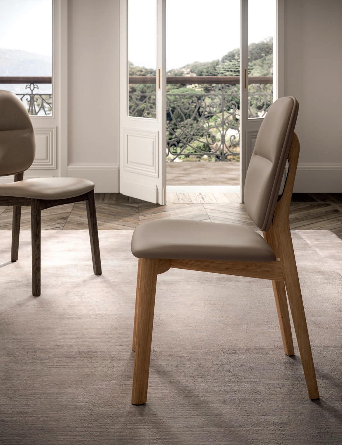Chair with upholstered backrest and seat in various finishes. ooden structure.