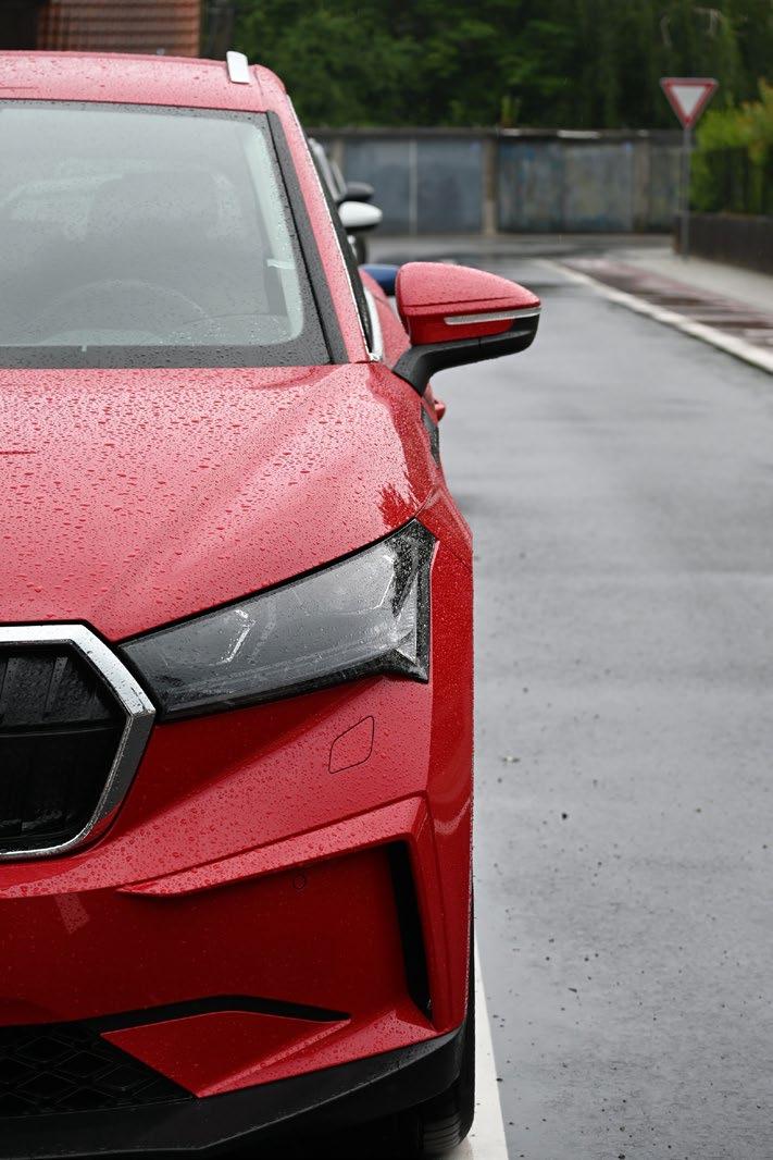 hlavičkou, je metaforou pre rapídny skok medzi mojím tri roky starým elektromobilom a súčasným vrcholom tejto technológie. Apropo, novinárska verzia Enyaq 85 Loft mala v príplatku uhrančivú červenú farbu s kódovým označením Velvet a nielen že táto farba autíčku pristala, ale súčasne mi v praxi potvrdila dávno zaužívanú frázu o červenej ako o farbe extrémne priťahujúcej pozornosť. Uvediem vám exaktný príklad: Počas testovania som bol na malom nákupe v zahraničí, čo robím ostatne bežne na svojom vlastnom voze. Moje auto je však bielej farby a za posledné dva roky, kedy